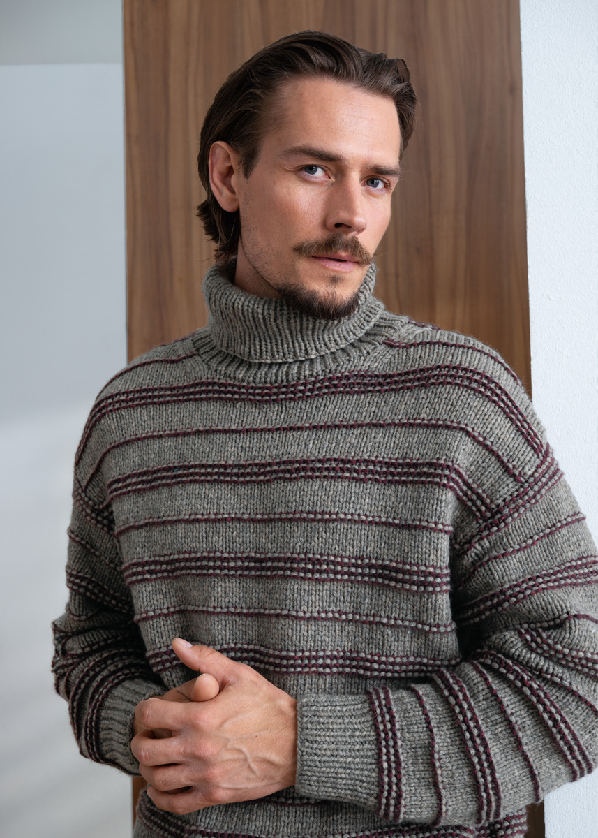 Lana Grossa Alta Moda Cashmere 16 (78% scheerwol (merino), 12% kasjmier, 10% polyamide, ca. 110 m/ 50 g), 550 (600 – 650) g taupe (kl 3) en 150 g Bourgondisch rood (kl 27); 1 rondbreinld 6 mm en 8 mm (60 cm lang), 1 rondbreinld 7 mm (40 cm lang).