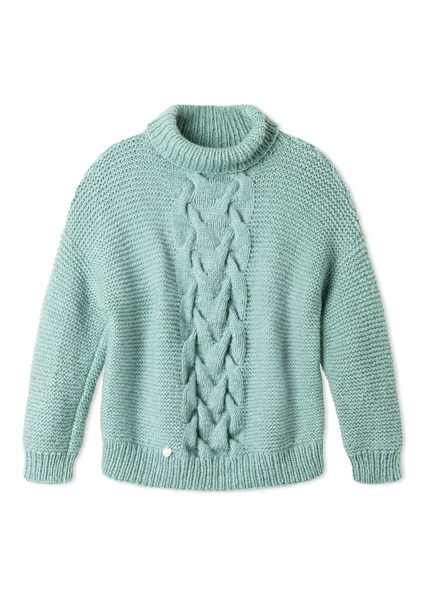 Lana Grossa-garen ‘Alta Moda Cashmere 16’ (78% scheerwol (merino), 12% kasjmier, 10% polyamide, ca. 110 m/50 g): ca. 550 (600 – 650) g mintturkoois (kl 34); breinld 7 mm en 8 mm, 1 rondbreinld 7 mm, 50 cm lang.