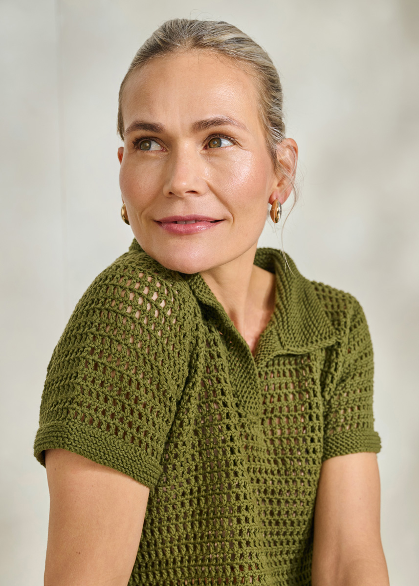 Lana Grossa Landlust Baumwolle (100% katoen (bio), ca. 115 m/50 g), 500 (550 – 600) g mosgroen (kl 32); 1 haaknld 3,5 mm en 1 rondbreinld 4 mm, 40 en 80 cm lang