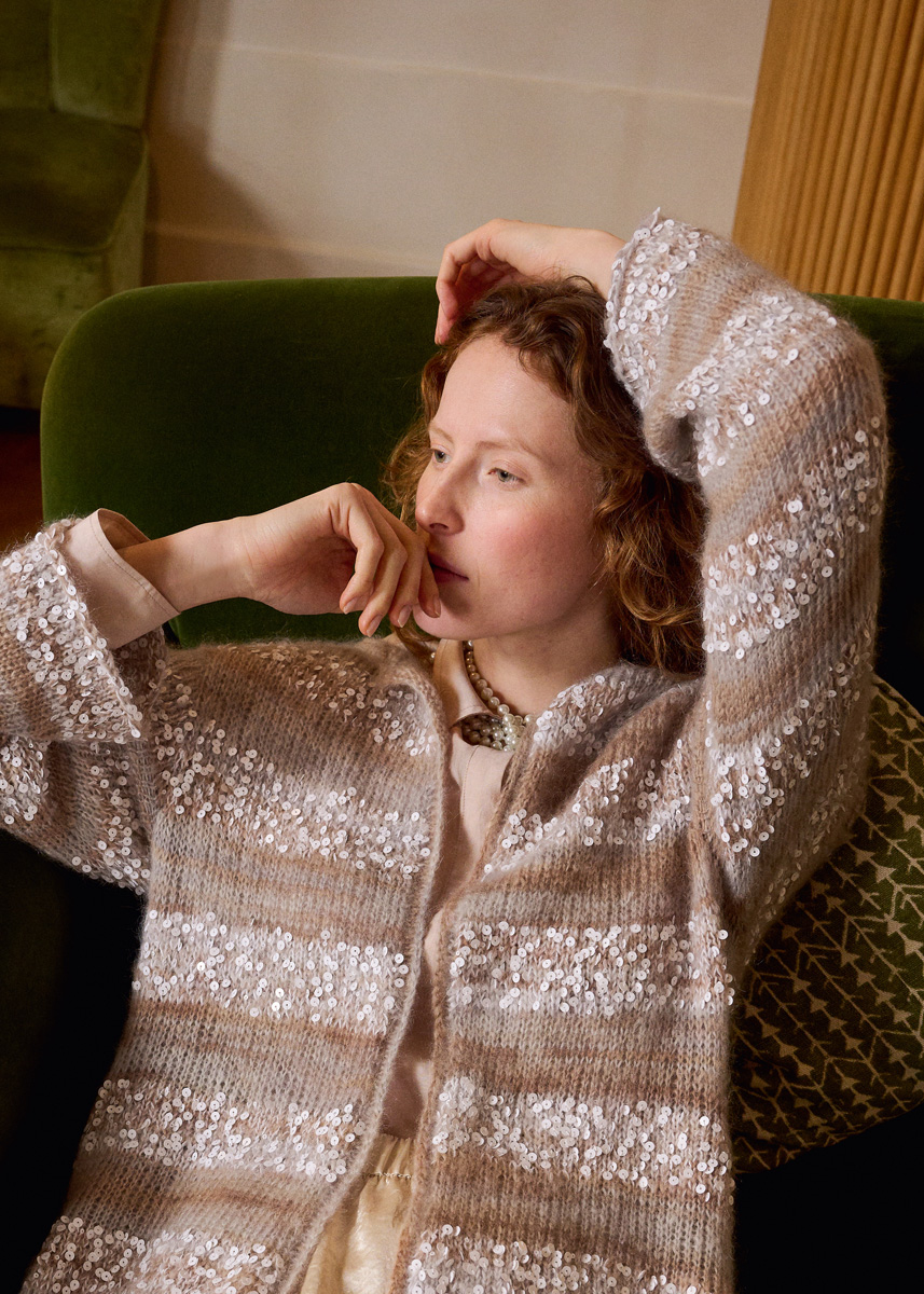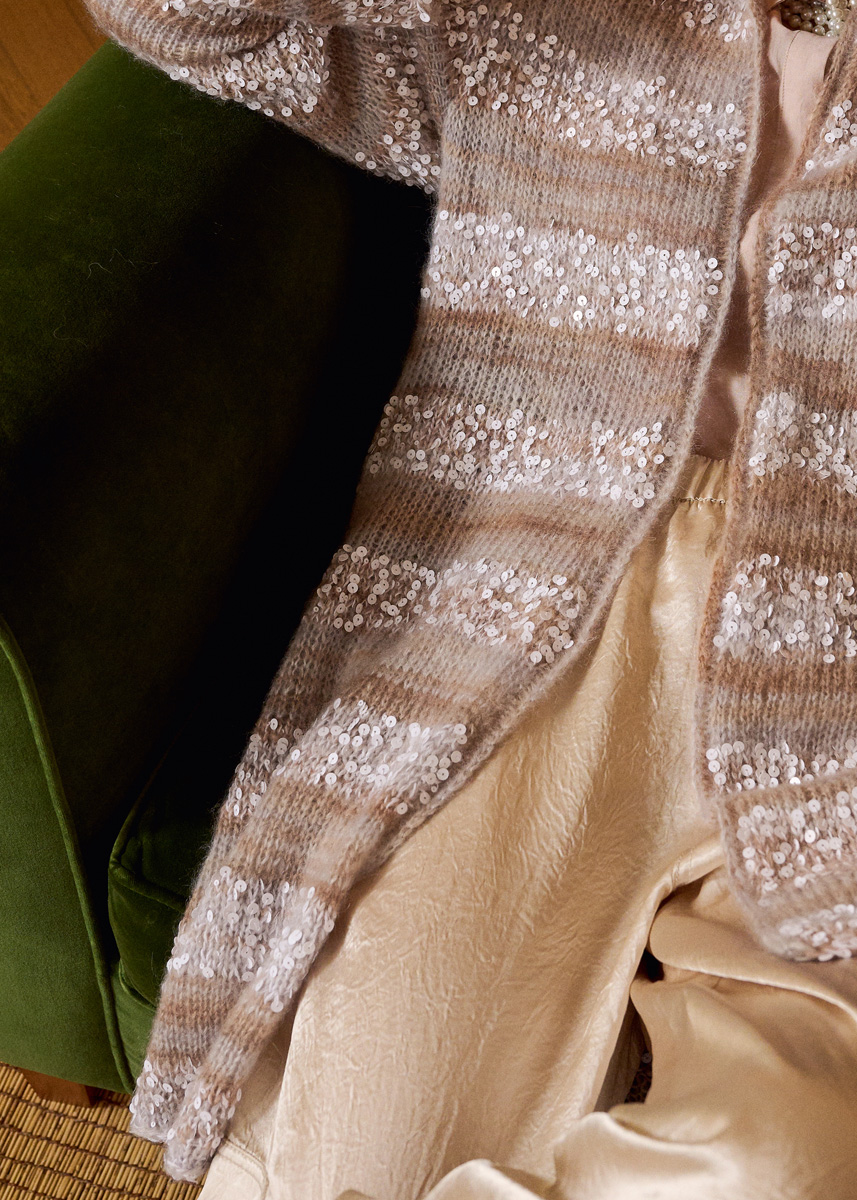 Lana Grossa-garen ‘Superkid Seta’ (65% mohair (superkid), 35% zijde, ca. 100 m/25 g): ca. 225 (250 - 275 - 300) g crème/beige/zilvergrijs (kl 101); Lana Grossa-garen ‘Cosmo’ (100% katoen (met pailletten), ca. 260 m/100 g): 200 (200 - 300 - 300) g wit (kl 1); korte en lange rondbreinld 4,5 mm en 5,5 mm; markeerringen.