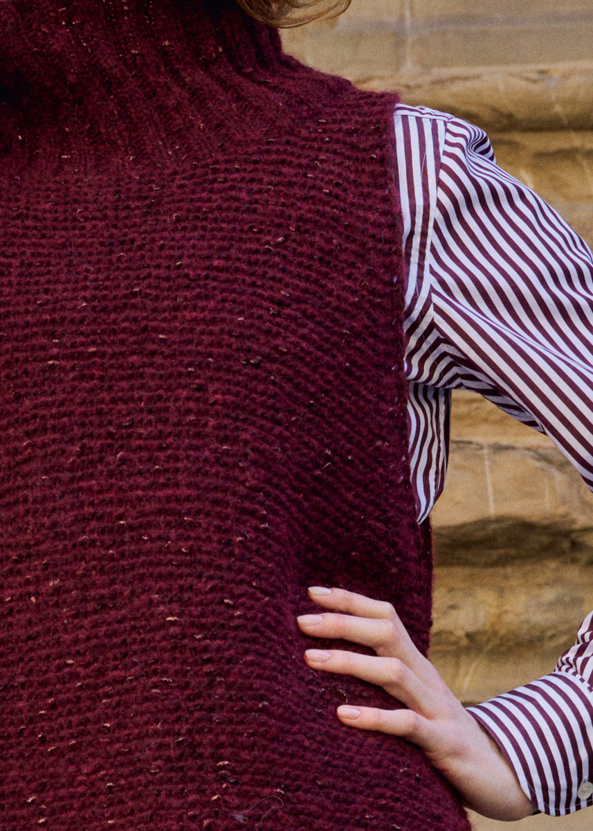 Lana Grossa-garen ‘Lucciola’ (29% polyamide, 24% scheerwol (merino fijn), 22% viscose, 20% alpaca (baby), 5% metallic vezels, ca. 130 m/50 g): ca. 350 (400 - 450 - 500) g zwartrood (kl 11); breinld 4 mm en 5 mm; 1 korte rondbreinld 4 mm.