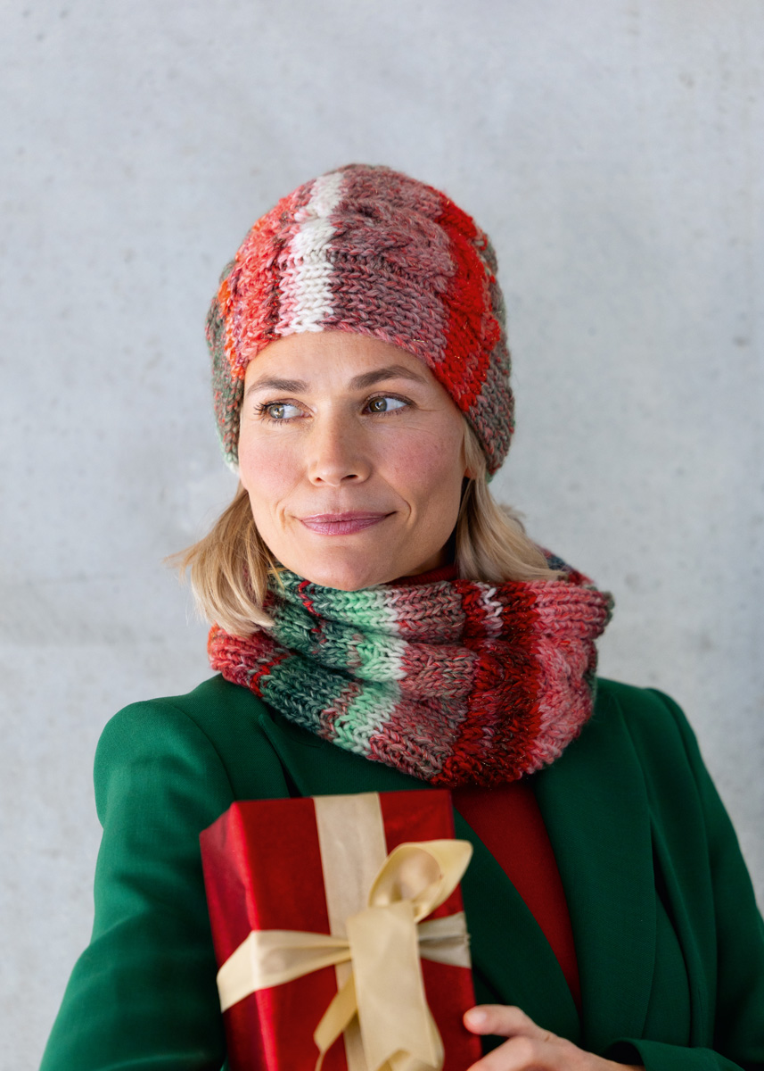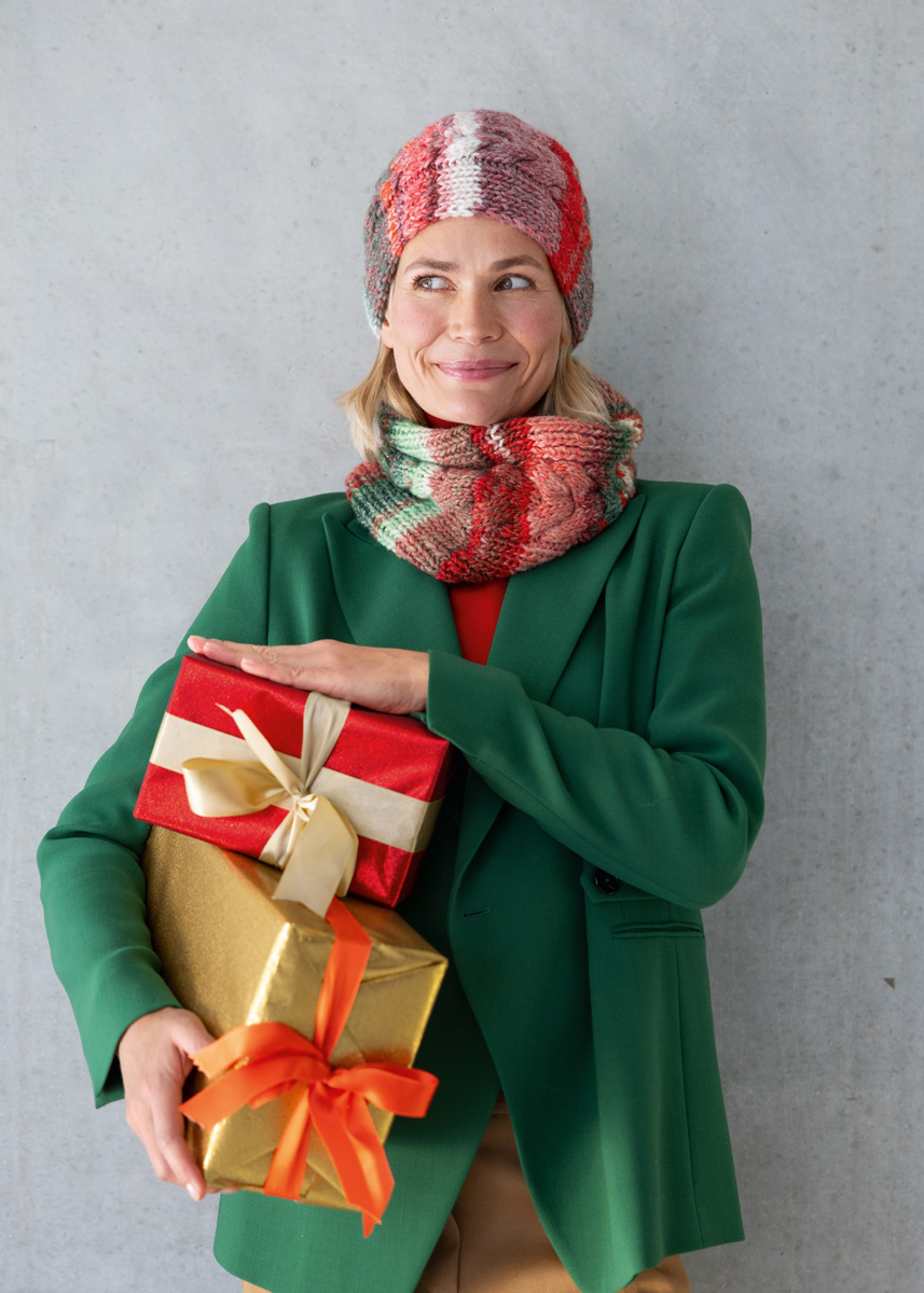Lana Grossa-garen Christmas Edition Big/Lurex (60% scheerwol, 40% polyacryl, ca. 180 m/100 g): 100 g grijsrood/rood/ecru/zwart-/witrood/oranje/donker-/witgroen/ donkergrijs/-rood verschillend gestreept (kl 203); breinld 6 mm; 1 kabelnaald.