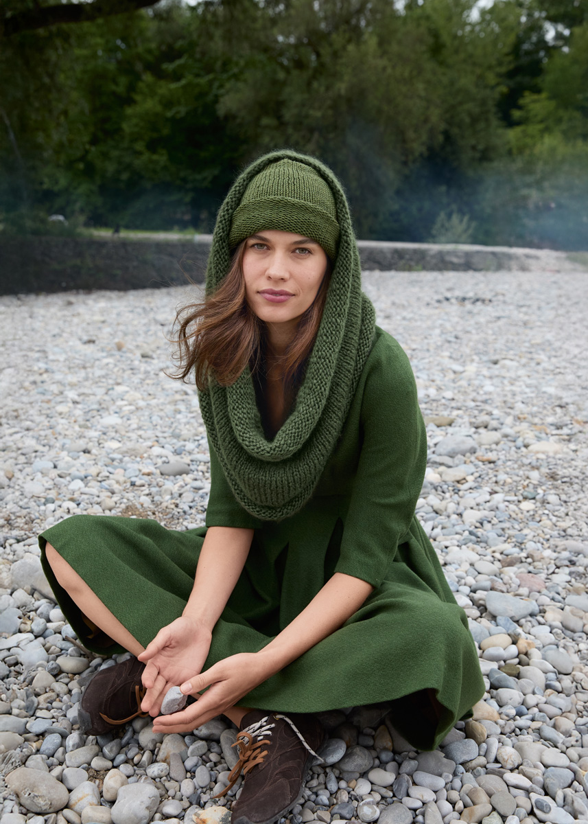 Lana Grossa ‘Mohair di Gio’ (55% mohair (superkid), 45% scheerwol (merino superfijn), ca. 85 m/50 g): 150 g vaarngroen (kl 14); lange rondbreinld 8 mm