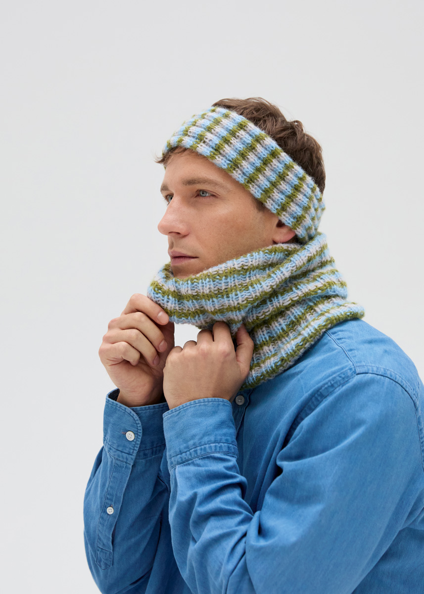 Lana Grossa ‘Nebbia’ (55% scheerwol (merino extrafijn), 45% (baby) alpaca, ca. 170 m/50 g): 50 g lichtblauw (kl 6), appelgroen (kl 10) en greige (kl 14); rondbreinld 5,5 mm