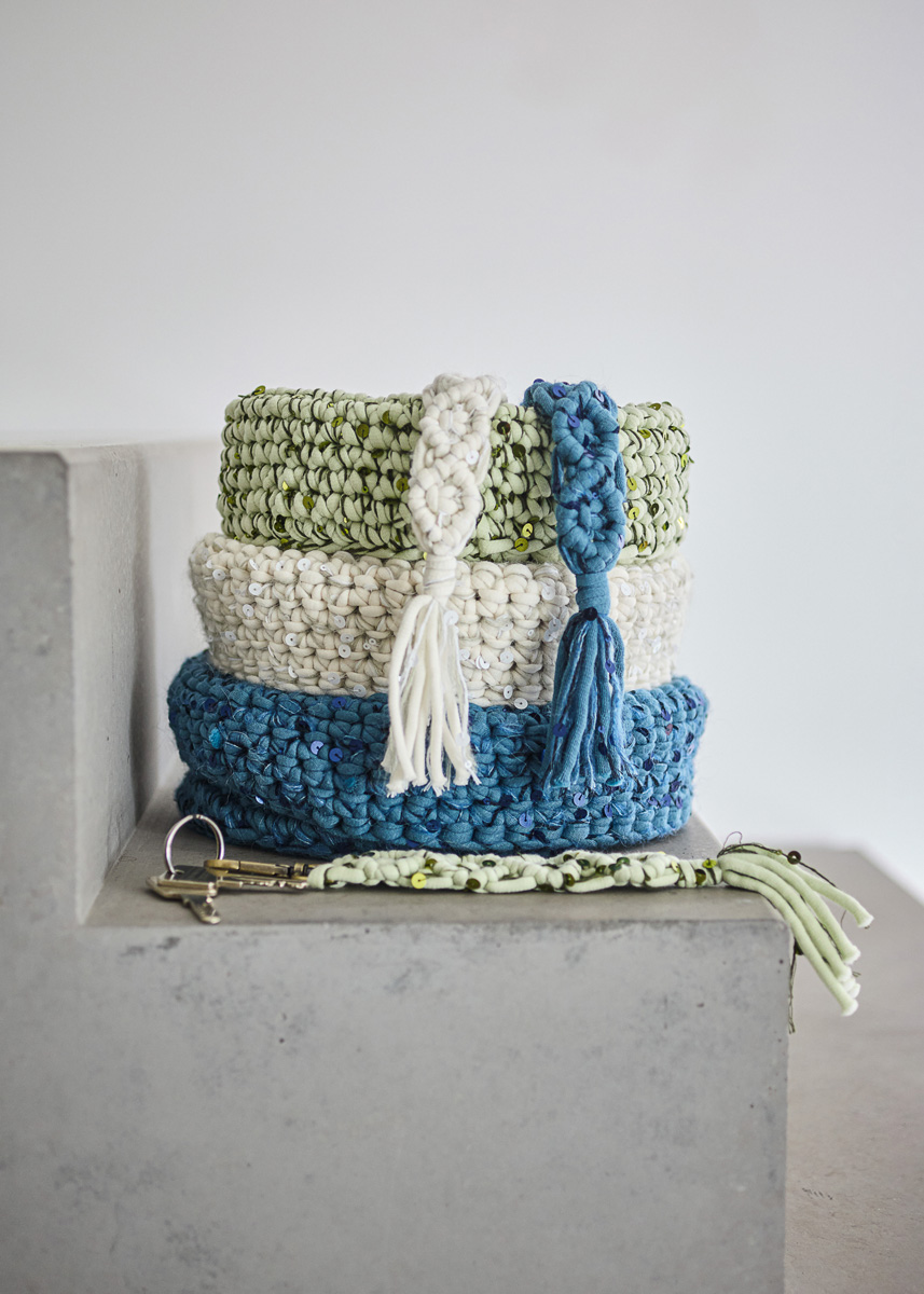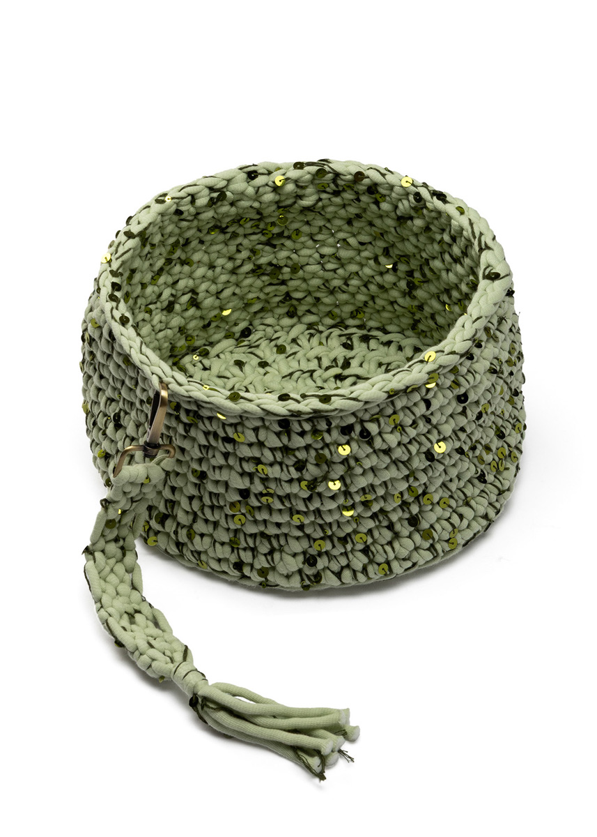 Lana Grossa-garen ‘The Tube’ (60% katoen, 40% nylon, ca. 114 m/200 g): ca. 200 g witgroen (kl 31) en Lana Grossa-garen ‘Cosmo’ (100% katoen (plus pailletten), ca. 260 m/100 g): ca. 100 g donkerolijf (kl 22); 1 haaknld 9 mm.