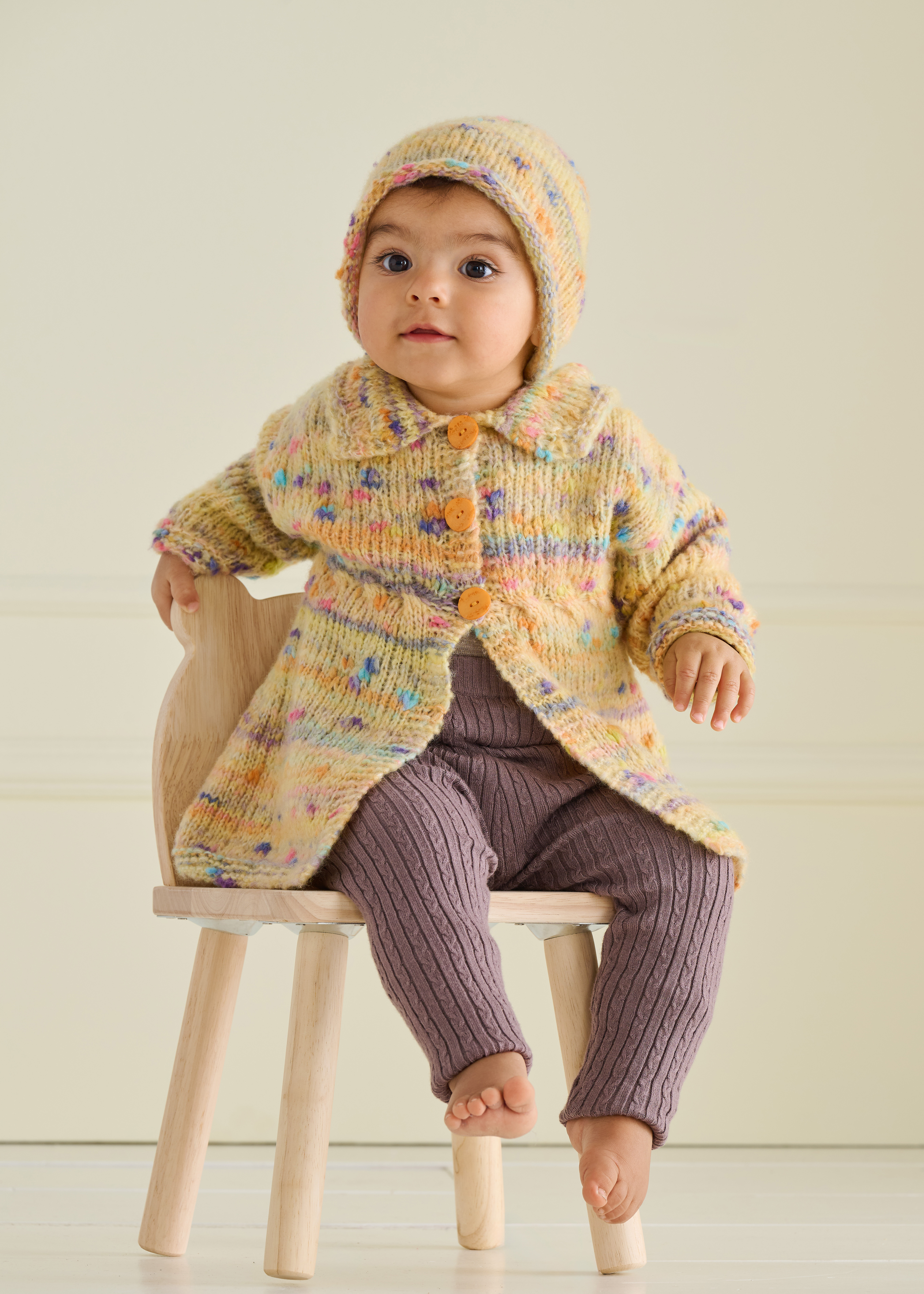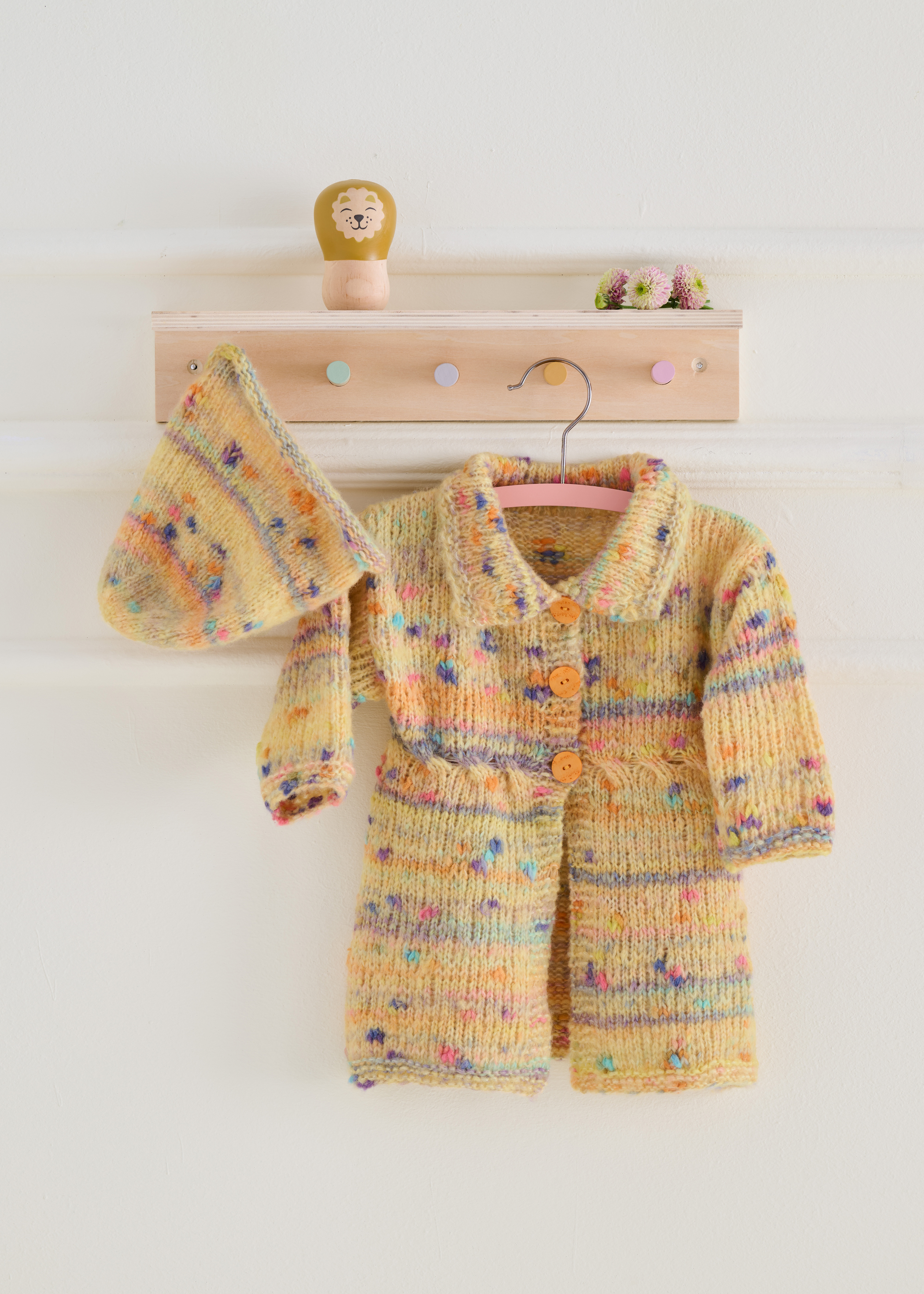 Lana Grossa Cassata (54% scheerwol (merino extrafijn), 30% polyamide, 16% katoen); ca. 175 m/50 g): 50 (100/100/100/150) g lichtgeel/citrusgeel/oudroze/grijsblauw/ grijsviolet (kl. 5); rondbreinld 5 mm; 2 (2/3/3/3) knopen met 15 (15/15/20/20) mm Ø.