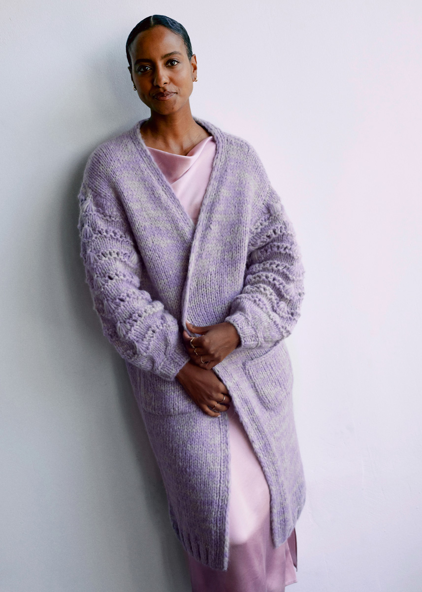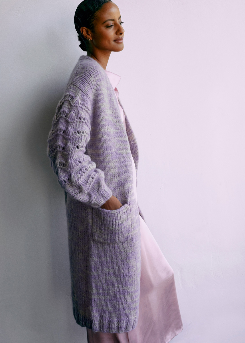 Lana Grossa-garen Lala Berlin Smoothy (62% alpaca (baby), 27% polyamide, 11% scheerwol (merino fijn), ca. 135 m/50 g): ca. 650 (700 - 750 - 800) g sering/lichtbeige (kl 2); breinld 7 mm en 8 mm.