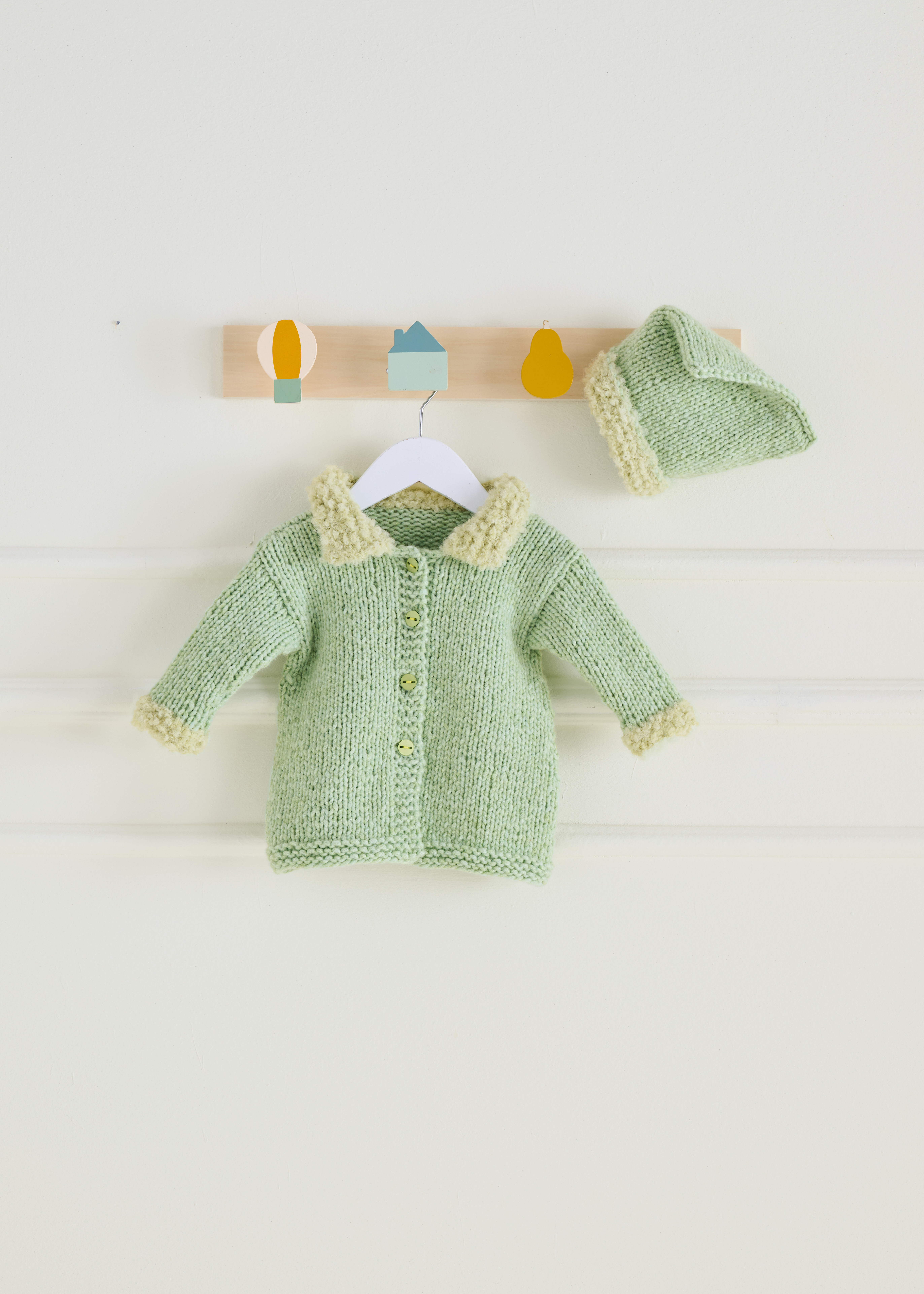 Lana Grossa Winter Softness (62% scheerwol (merino extrafijn), 38% katoen (bio); ca. 70 m/50 g): 150 (150/200/250) g witgroen (kl. 3) en Lana Grossa Orsetto (60% scheerwol (merino), 40% alpaca (superfijn); ca. 75 m/50 g): 50 g witgroen (kl. 10); rondbreinld 6,5 mm; 2 markeerringen; 4 bijpassende knopen, 15 mm Ø.