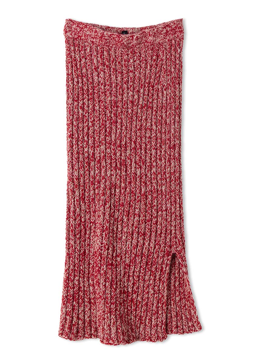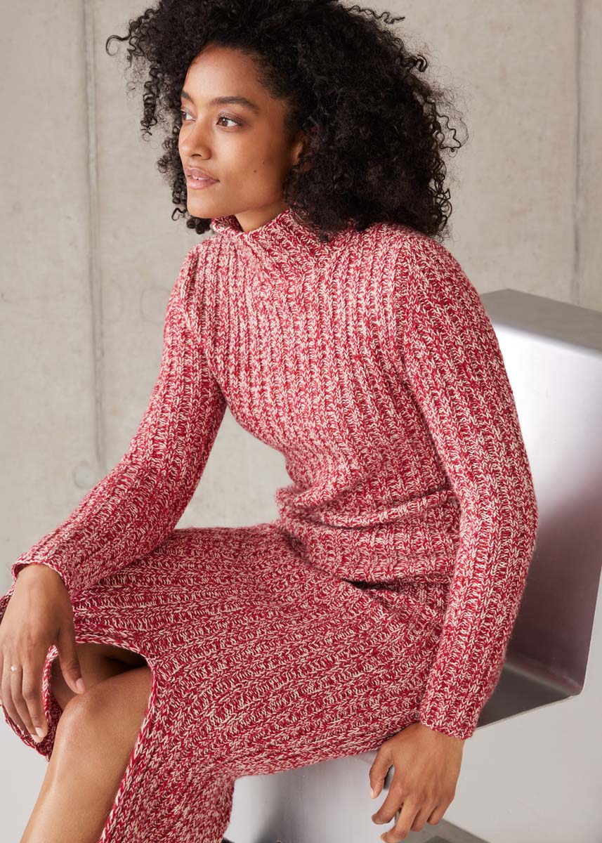 Lana Grossa Ecopuno (72% katoen, 17% scheerwol (merino), 11% (baby) alpaca, ca. 215 m/50 g), 250 (300 - 350) g parelbeige (kl 66) en 250 (300 - 350) g kersrood (kl 47); een 80 cm lange rondbreinld 4,5 mm; 2 markeerringen; ca. 80 (86 - 95) cm elastiek, 4 cm breed voor de tailleband.