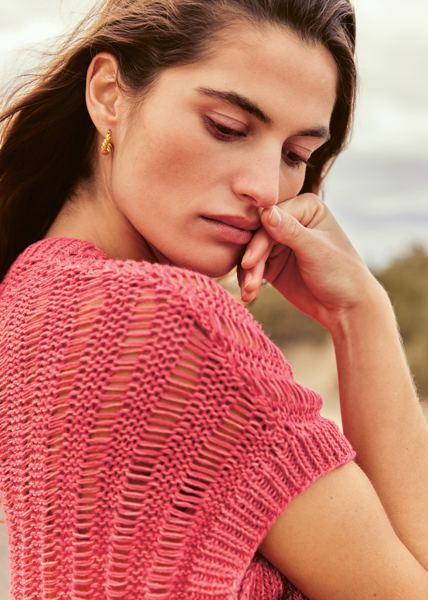 Lana Grossa-garen ‘Linissimo’ (50% linnen, 50% katoen, ca. 187 m/50 g): ca. 150 (200) g aardbeirood (kl 6) en Lana Grossa-garen ‘Solo Lino’ (80% gerecycled linnen (viscose), 20% linnen, ca. 120 m/50 g): ca. 250 (300) g flamingorood (kl 67); breinld 4 en 5,5 mm, 1 rondbreinld 4 mm, 40 en 60 cm lang, 1 haaknld 4 mm.