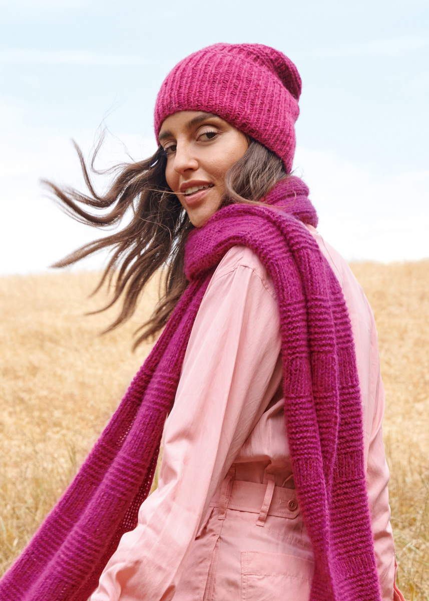Lana Grossa Brigitte No. 2 (47% alpaca (baby), 45% katoen, 8% wol (merino), looplengte 140 m/50 g), 50 g fuchsia (kl. 38); sokkennaalden nr. 5 en een rondbreinaald nr. 5 van 40 cm.
