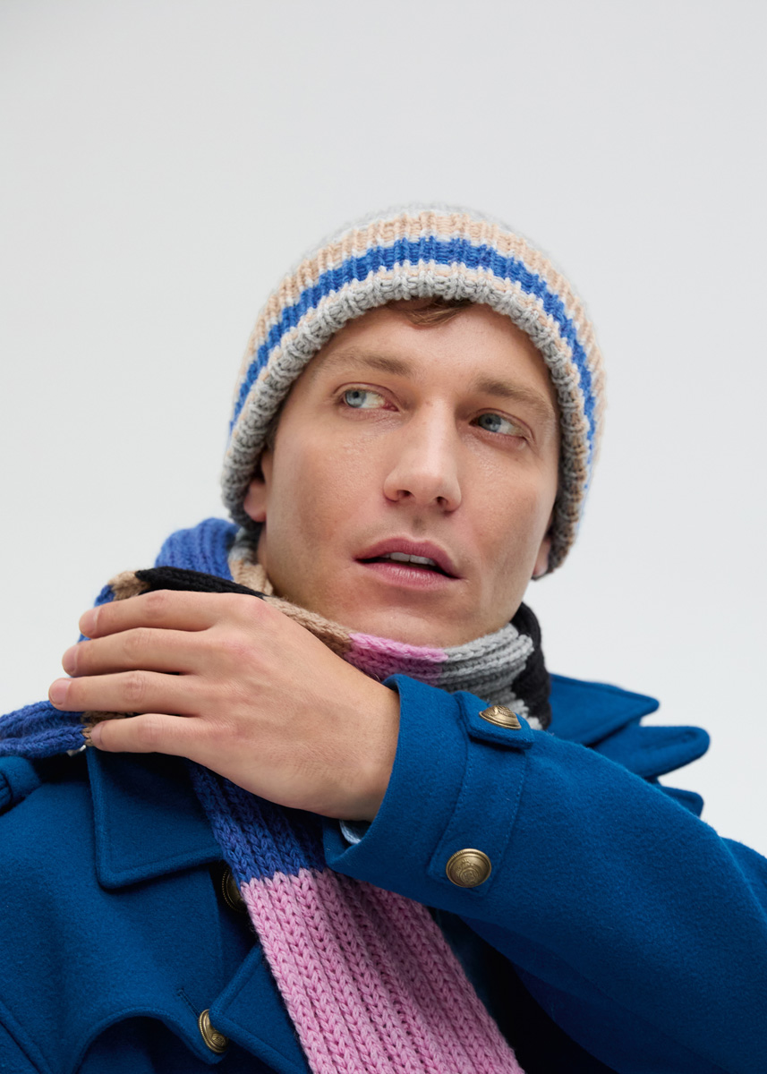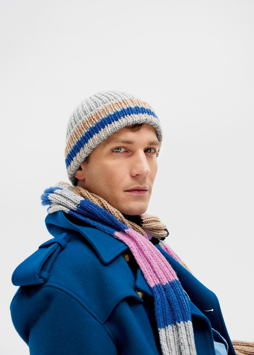 Lana Grossa ‘Cool Merino’ (90% scheerwol (merino), 10% polyamide ca. 150 m/50 g): 50 g lichtgrijs (kl 13), 50 g saffierblauw (kl 39) en beige (kl 40); breinld zonder knop 5 mm