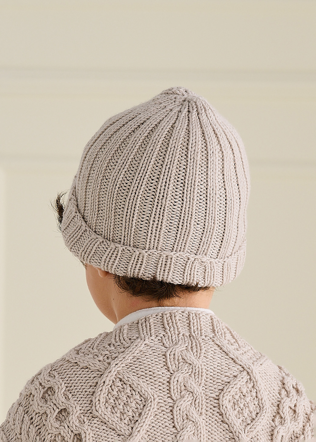 Lana Grossa Cool Wool Big (100% scheerwol (merino extrafijn); ca. 120 m/50 g): 50 (50/100/100/150) g greige (kl. 1010); breinld zonder knop 4 mm (alternatief: met een rondbreinld volgens de magic-loop-methode breien); markeerringen