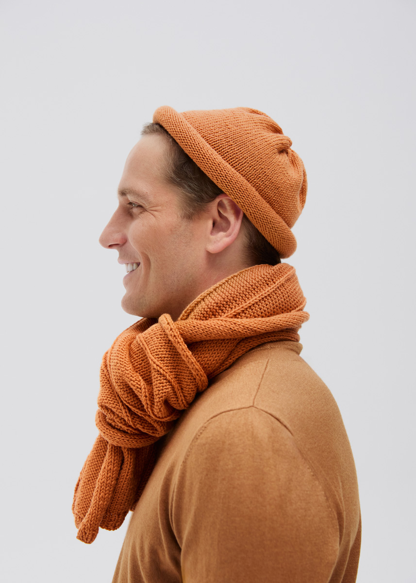 Lana Grossa ‘Cool Wool’ (100% scheerwol (merino extrafijn), vervilt niet, ca. 160 m/50 g): 100 g oranjebruin (kl 2116); breinld zonder knop 3,5 mm.