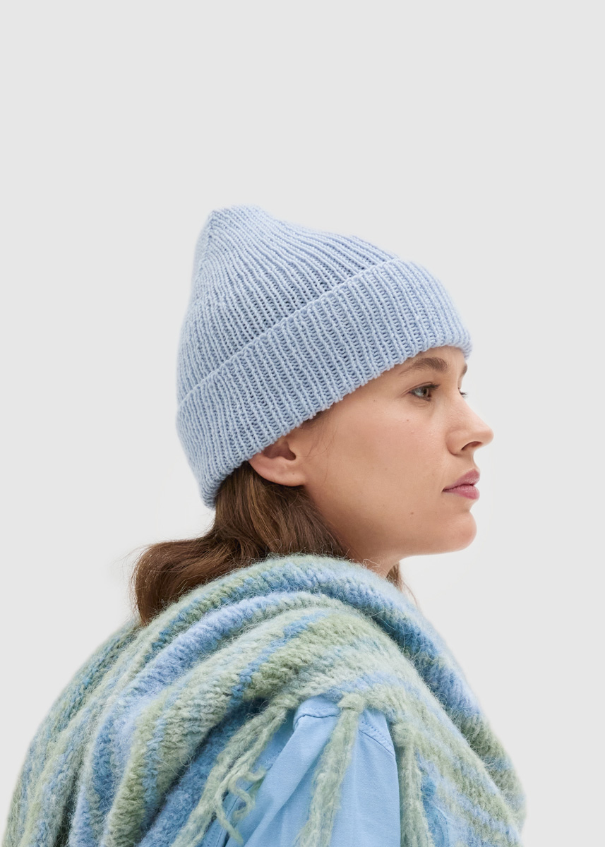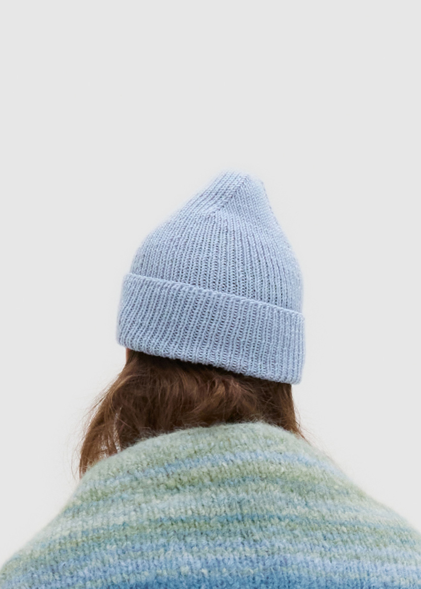 Lana Grossa ‘Cool Wool’ (100% scheerwol (merino extrafijn), vervilt niet, ca. 160 m/50 g): 100 g zachtblauw (kl 2119); breinld zonder knop 3,5 mm; markeerringen