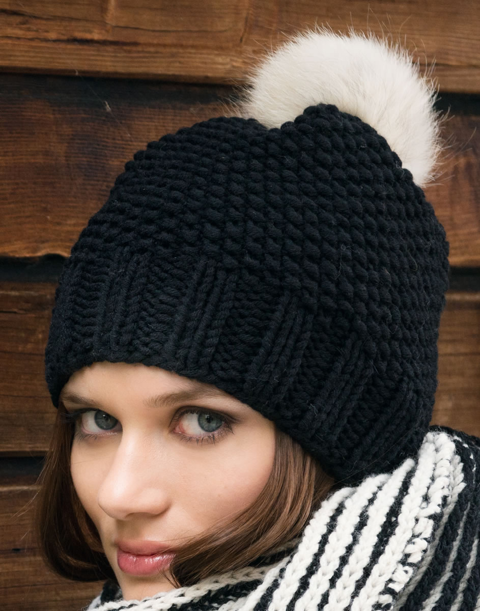 Interessant effect: brei het patentpatroon met wit en zwart. Draag hierbij een effen zwarte muts met supergrote witte pompon. (Hoofdomvang 54 – 56 cm, lengte ca. 22 cm)