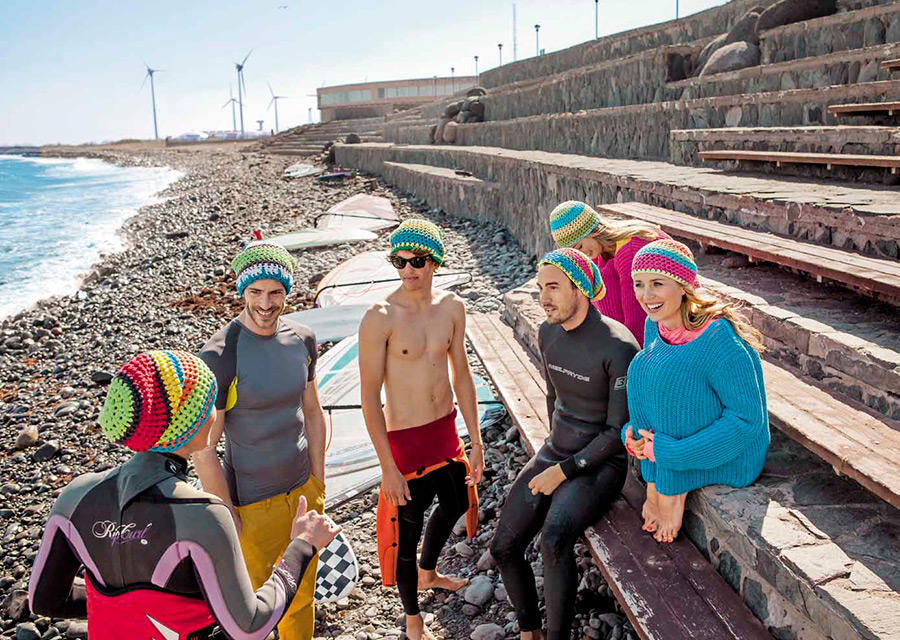 telk. 50 g “Organico” (100% bio katoen, ll. = 90 m/50 g) van Lana Grossa in mauve (kl. 52), kaki (kl. 40), cyclaam (kl. 59), petrol (kl. 44), pistache (kl. 41), staalgrijs (kl. 4), oranje (kl. 55); breinld. nr. 5; 1 korte rondbreinld. of breinld. zonder knop nr. 4,5.