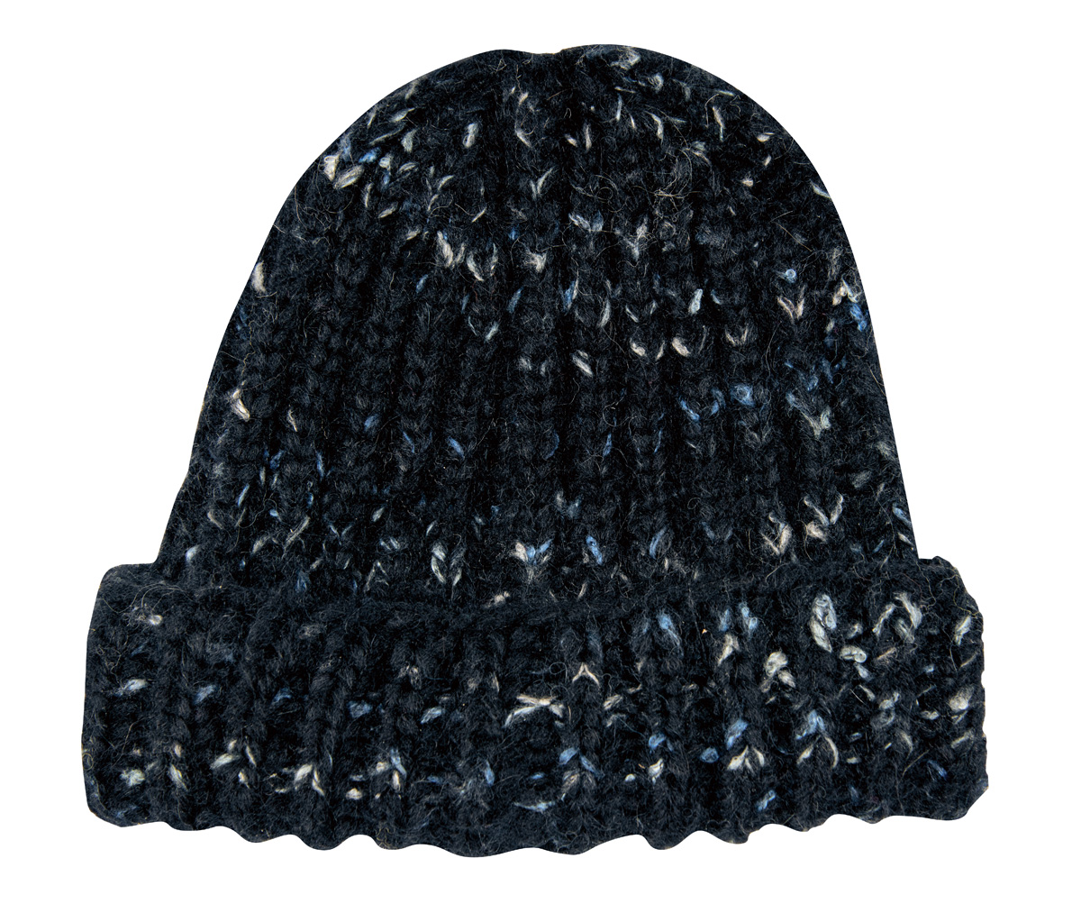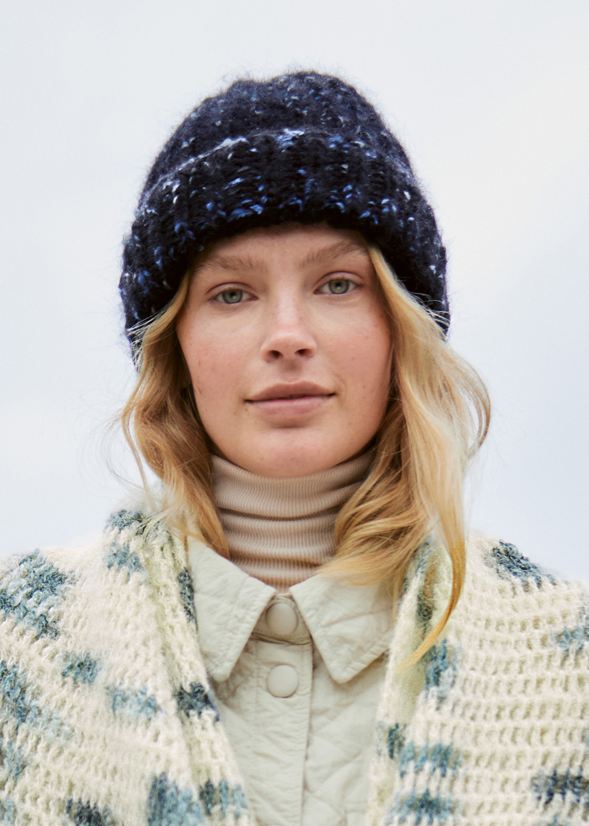 Lana Grossa-garen ‘Lala Berlin Hazy’ (40% (baby) alpaca, 25% scheerwol (merino superfine), 25% polyamide, 6% tencel, 4% katoen, ca. 250 m/50 g): 50 g zwart/ lichtgrijs/grijs (kl 12) en Lana Grossa-garen ‘Brigitte No. 2’ (47% (baby) alpaca, 45% katoen, 8% scheerwol (merino), ca. 140 m/50 g): 50 g zwart (kl 36), korte rondbreinld of breinld zonder knop 5 mm