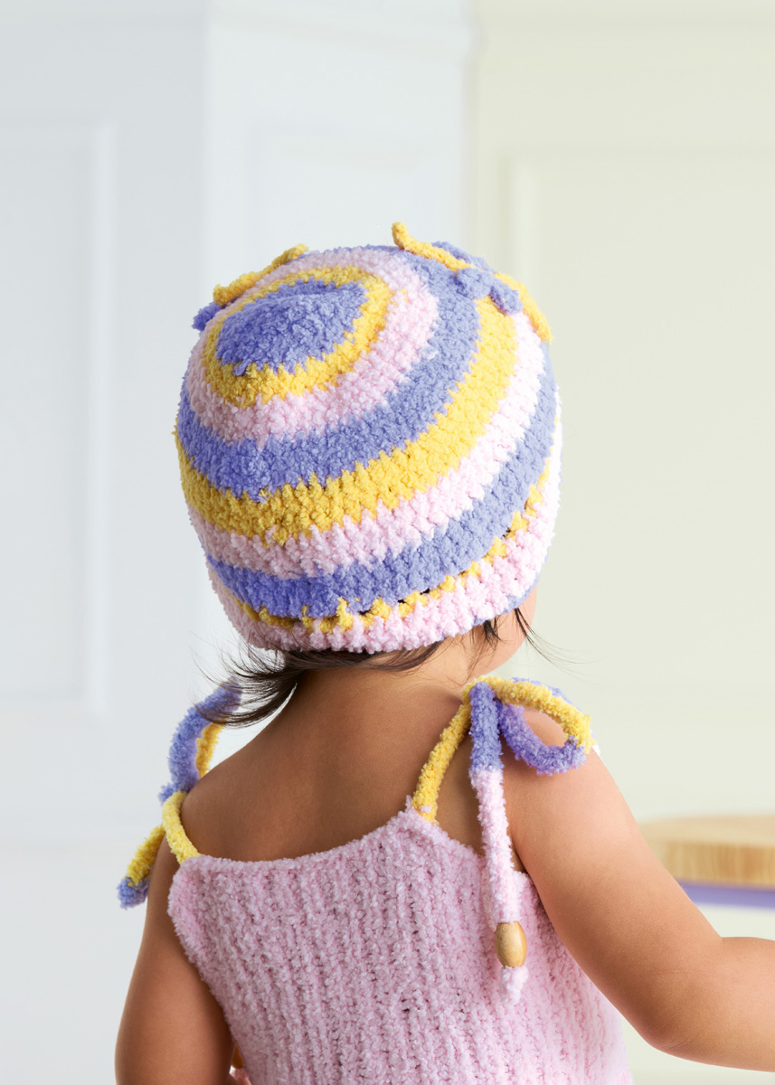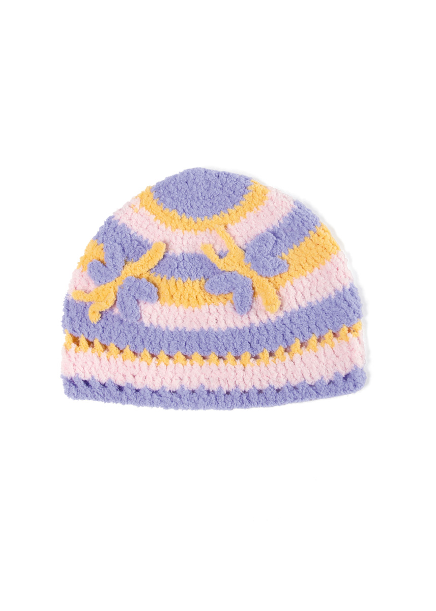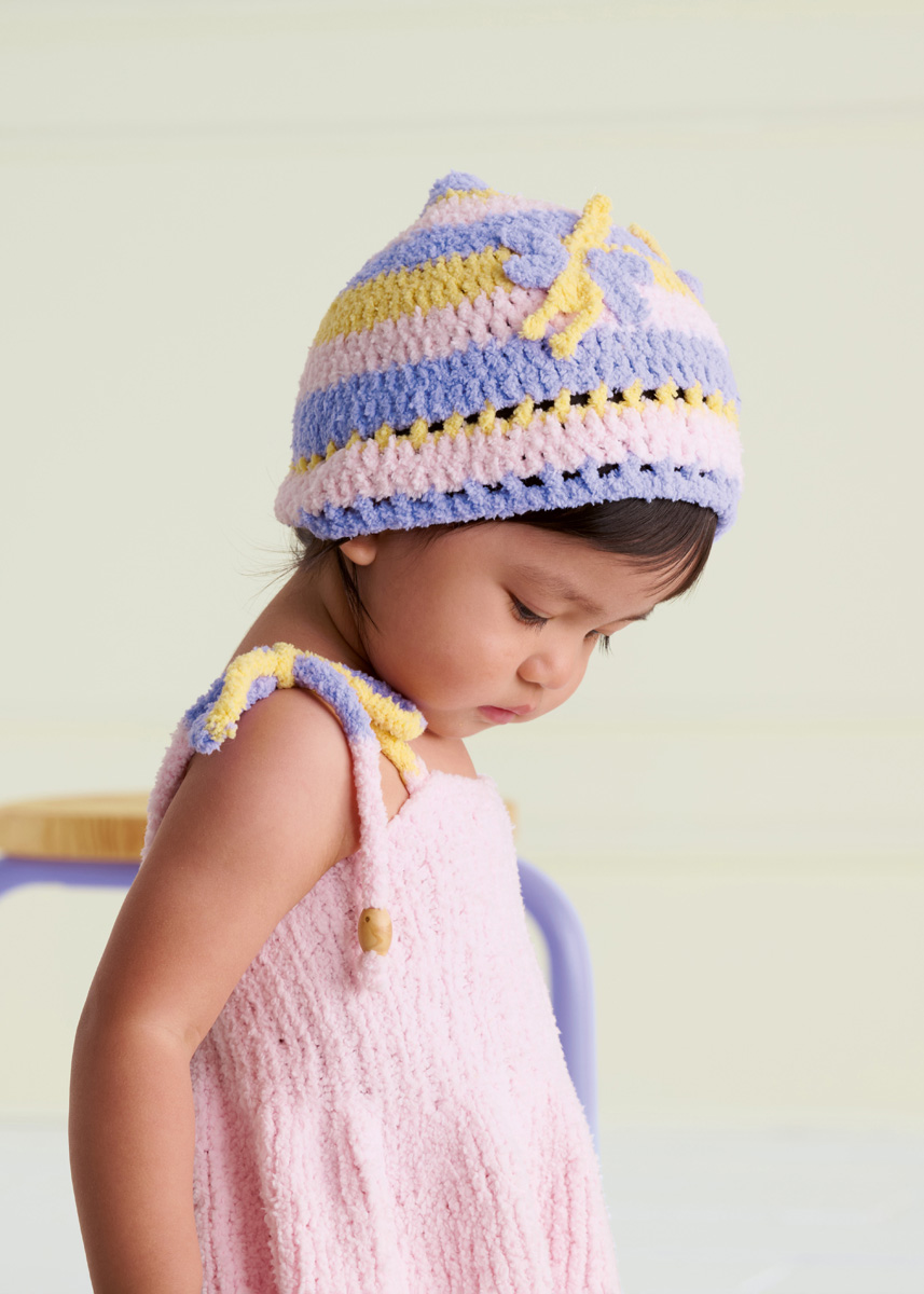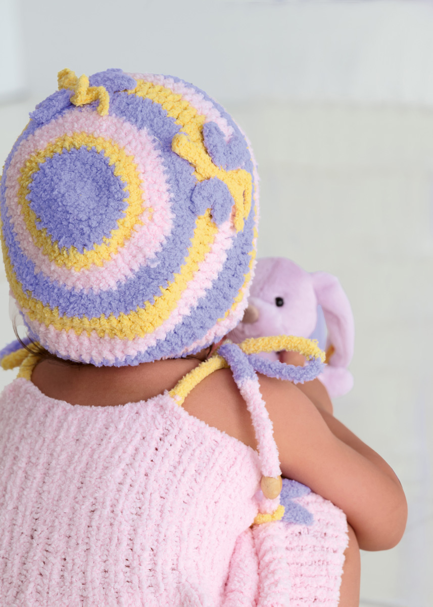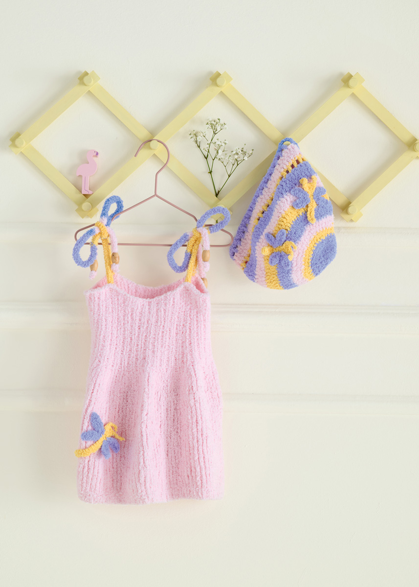 Lana Grossa Leggerissimo (100% gerecyclede polyamide); ca. 150 m/50 g): 50 g heel lichtroze (kl 7), geel (kl 1) en paars (kl 8); haaknld 4 mm.