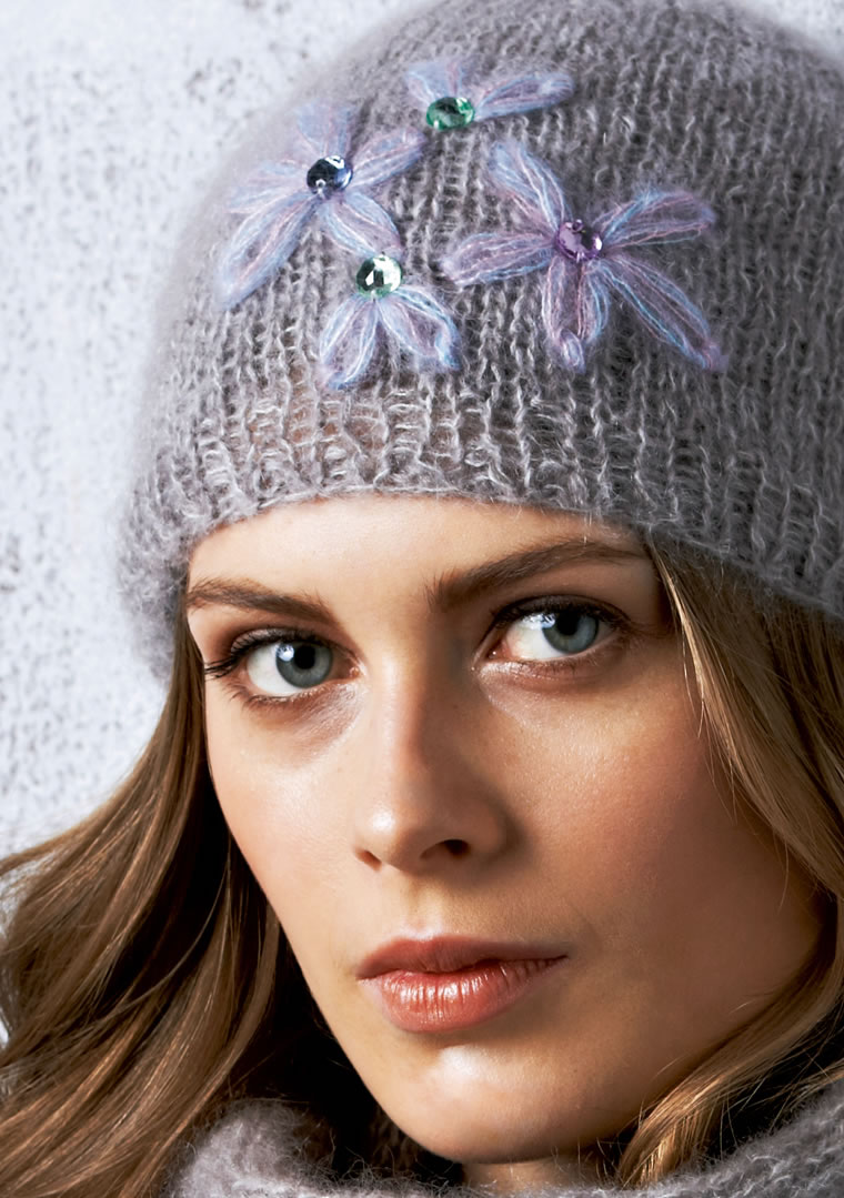„Silkhair“ (70% mohair (superkid), 30% zijde, ll. = 210 m/25 g) van Lana Grossa: telk. ca. 25 g taupe (kl. 35) en naturel (kl. 58), voor het borduurwerk telk. ca. 25 g zachtpaars (kl. 87). lichtturkoois (kl. 82) en bleekpaars (kl. 59); telk. een set met 5 breinld. zonder knop nr. 5,5 en 6; 1 stompe borduurnaald; kristallen om op te naaien van Union Knopf, art. 451701, maat 10, 2x kl. 24 lichtgroen, telk. 1x kl. 60 roze en kl. 74 grijsblauw.