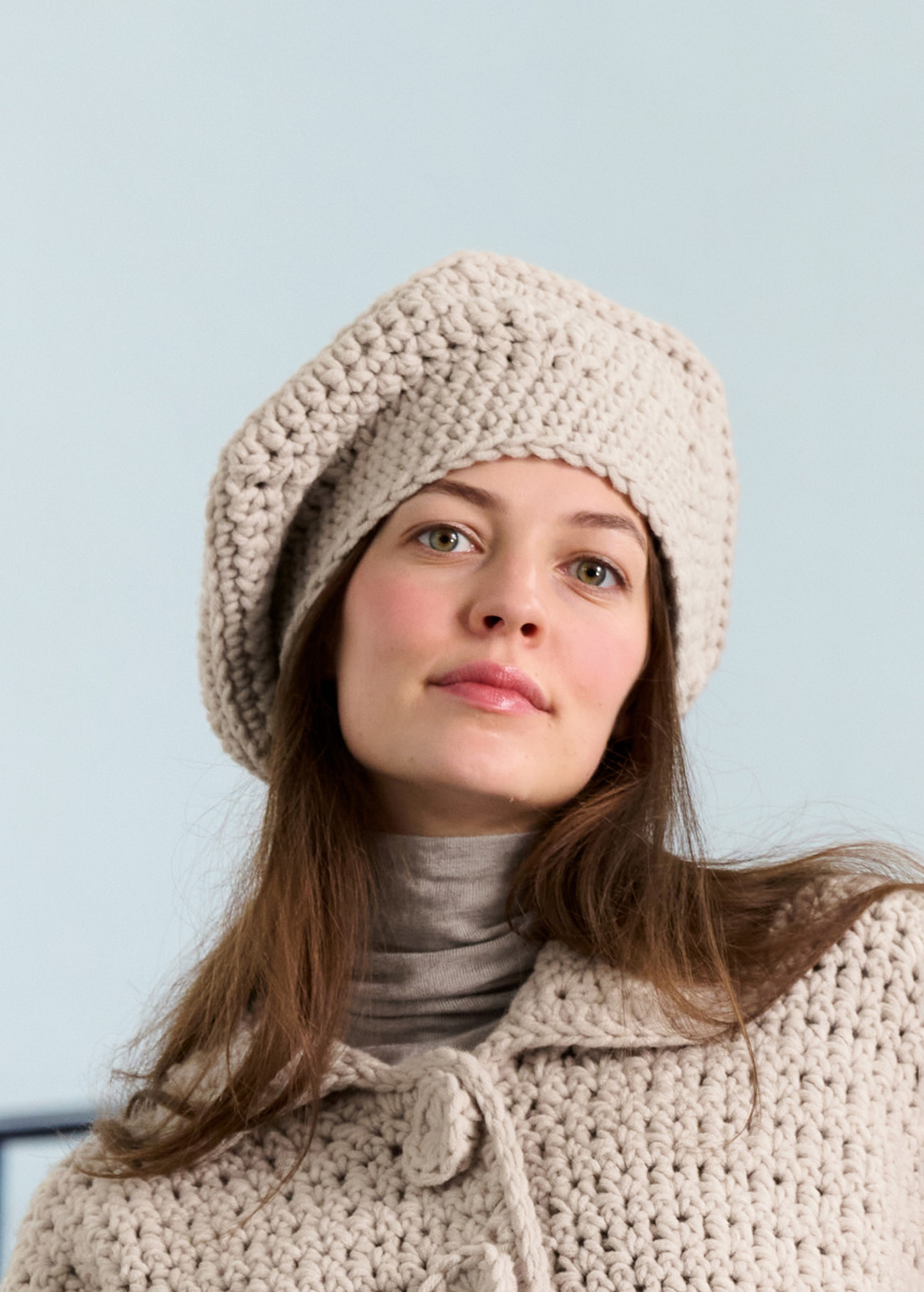 Lana Grossa Mille II (50% scheerwol (merino), 50% polyacryl, ca. 55 m/50 g), 150 g greige (kl 138); 1 haaknld 8 mm.