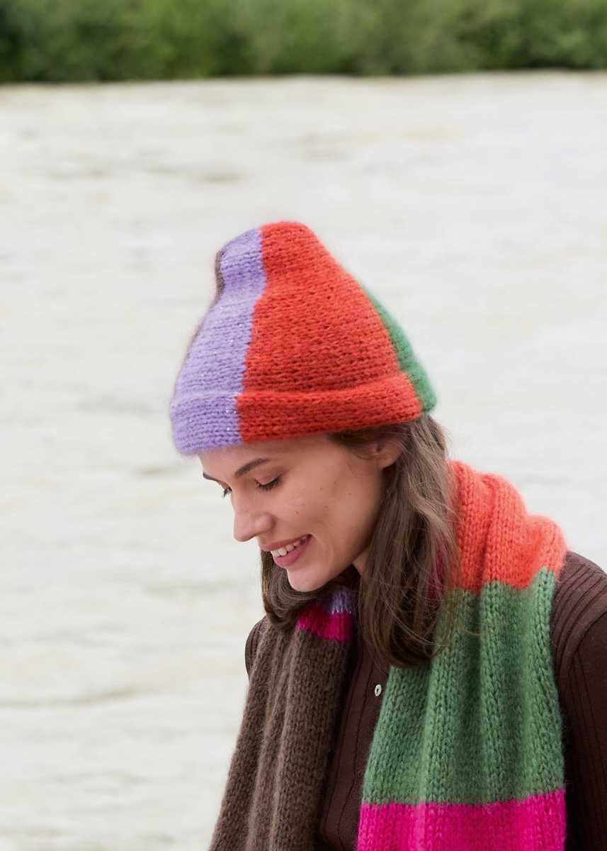 Lana Grossa ‘Mohair di Gio’ (55% mohair (superkid), 45% scheerwol (merino superfijn), ca. 85 m/50 g): 50 g grijsbruin (kl 7), oranjerood (kl 6), seringpaars (kl 1), felroze (kl 3) en resedagroen (kl 13) en Lana Grossa ‘Glamour’ (55% polyamide, 45% polyester, ca. 115 m/25 g): 25 g grijspaars (kl 2); breinld 7 mm.