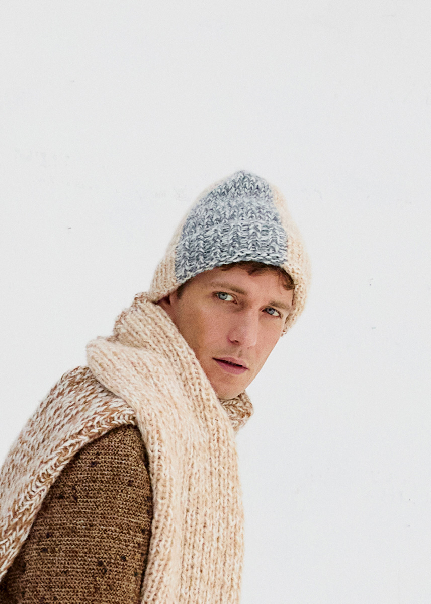 Lana Grossa ‘Nebbia’ (55% scheerwol (merino extrafijn), 45% (baby) alpaca, ca. 170 m/50 g): 50 g donkergrijs (kl 7), camel (kl 12), beige (kl 13) en gebroken wit (kl 15); breinld 8 mm en 10 mm.