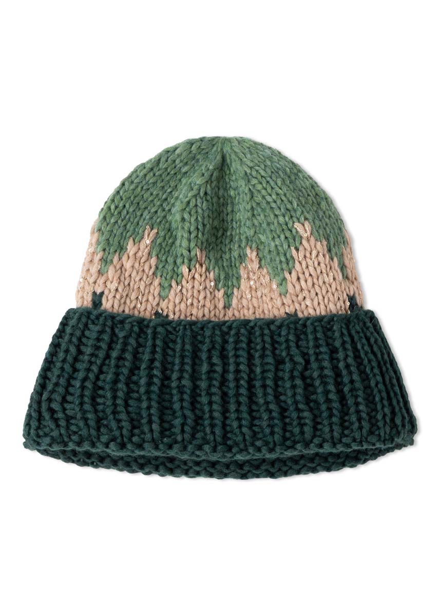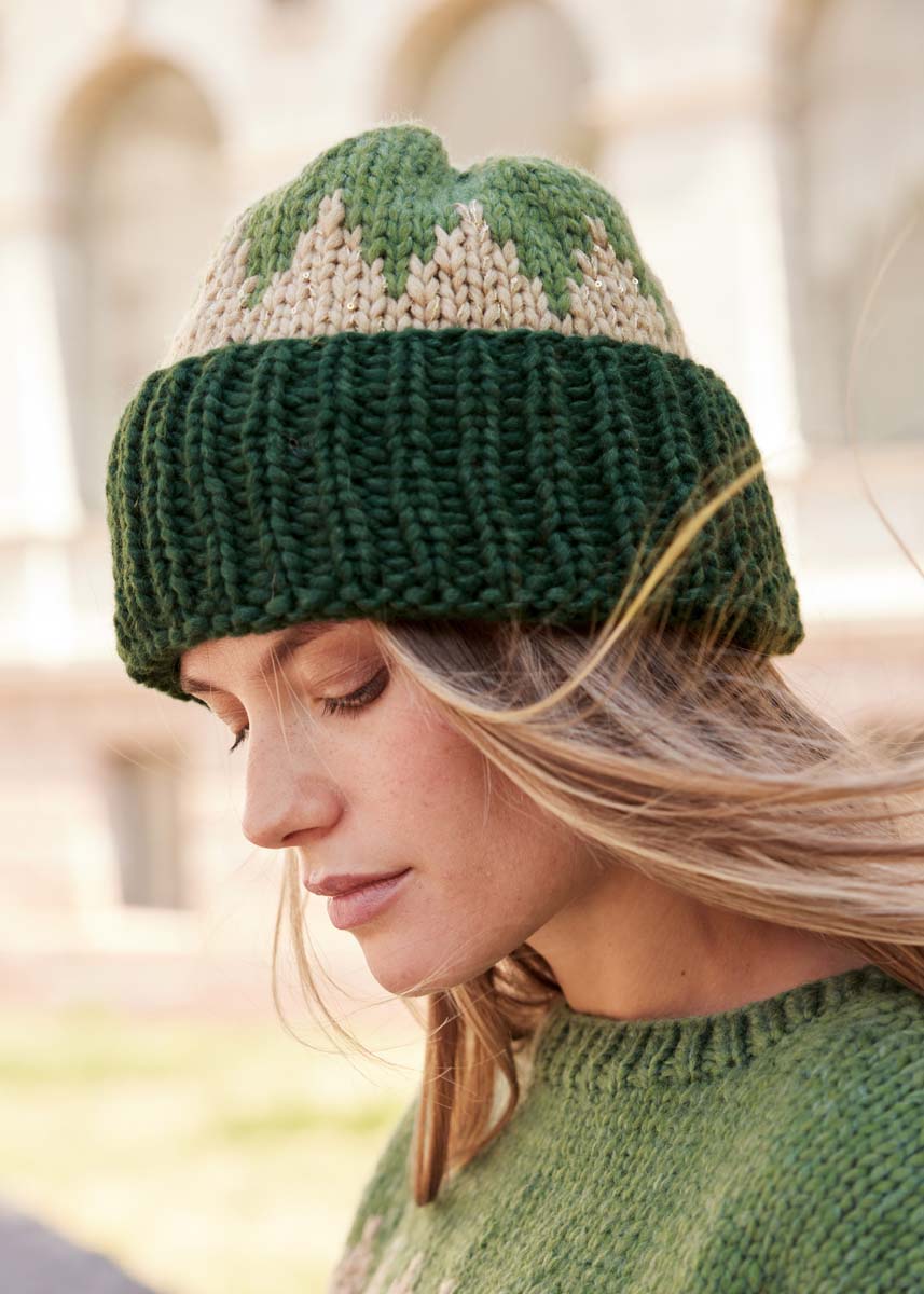 Lana Grossa Winter Softness (62% scheerwol (merino extrafijn), 38% katoen, ca. 70 m/50 g), 50 g bosgroen (kl 4), 50 g donkergroen (kl 5), 50 g beige (kl 18) en Lana Grossa Glamour (55% polyamide, 45% polyester, ca. 112 m/25 g), 25 g beige (kl 10); 5 breinld zonder knop (breinld zonder knop) 7 mm; 6 markeerringen.