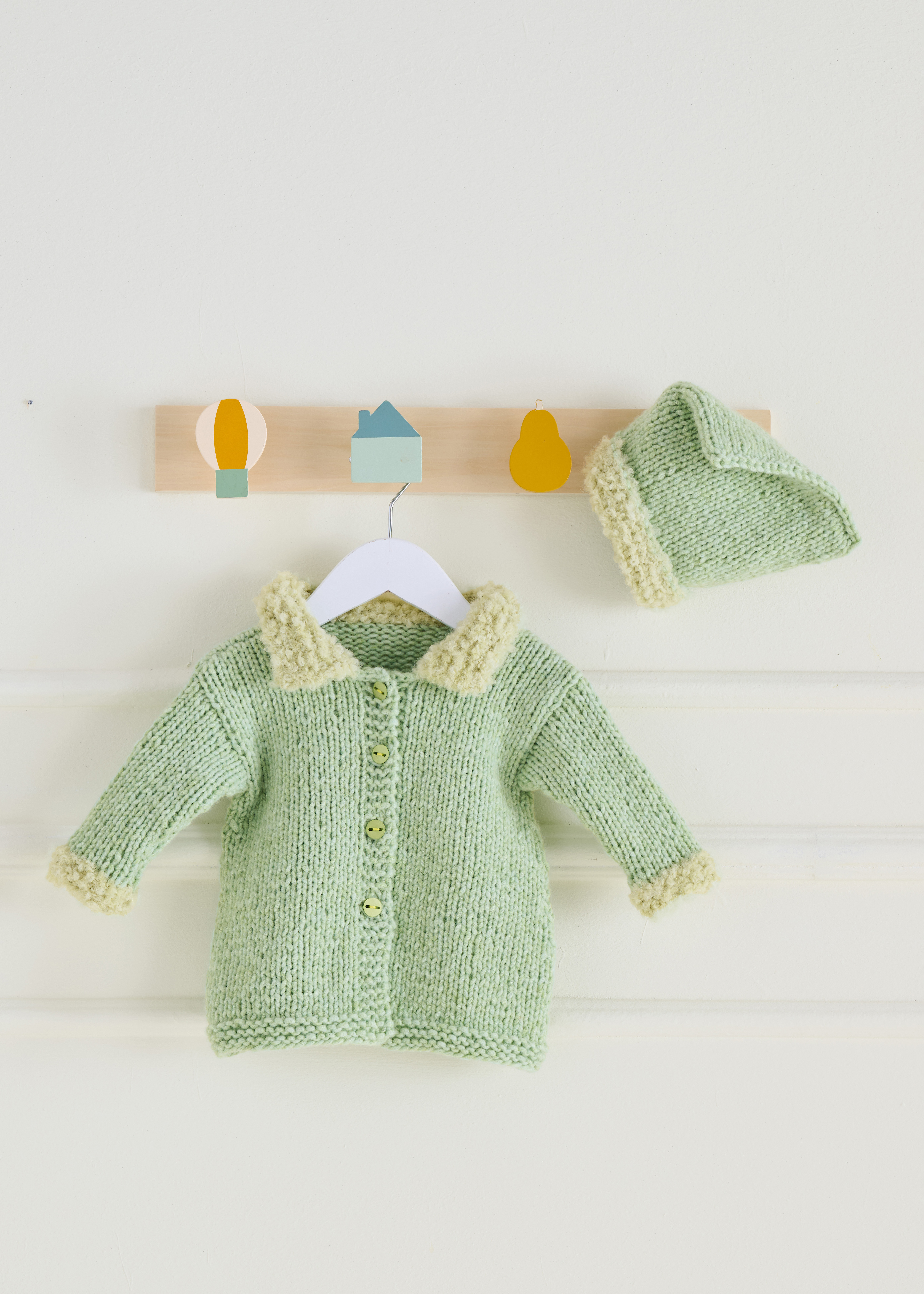Lana Grossa Winter Softness (62% scheerwol (merino extrafijn), 38% katoen (bio); ca. 70 m/50 g): 50 g witgroen (kl. 3) en Lana Grossa Orsetto (60% scheerwol (merino), 40% alpaca (superfijn); ca. 75 m/50 g): 50 g witgroen (kl. 10); rondbreinld 6,5 mm; een breinld zonder knop of rondbreinld 6,5 mm; 2 markeerringen