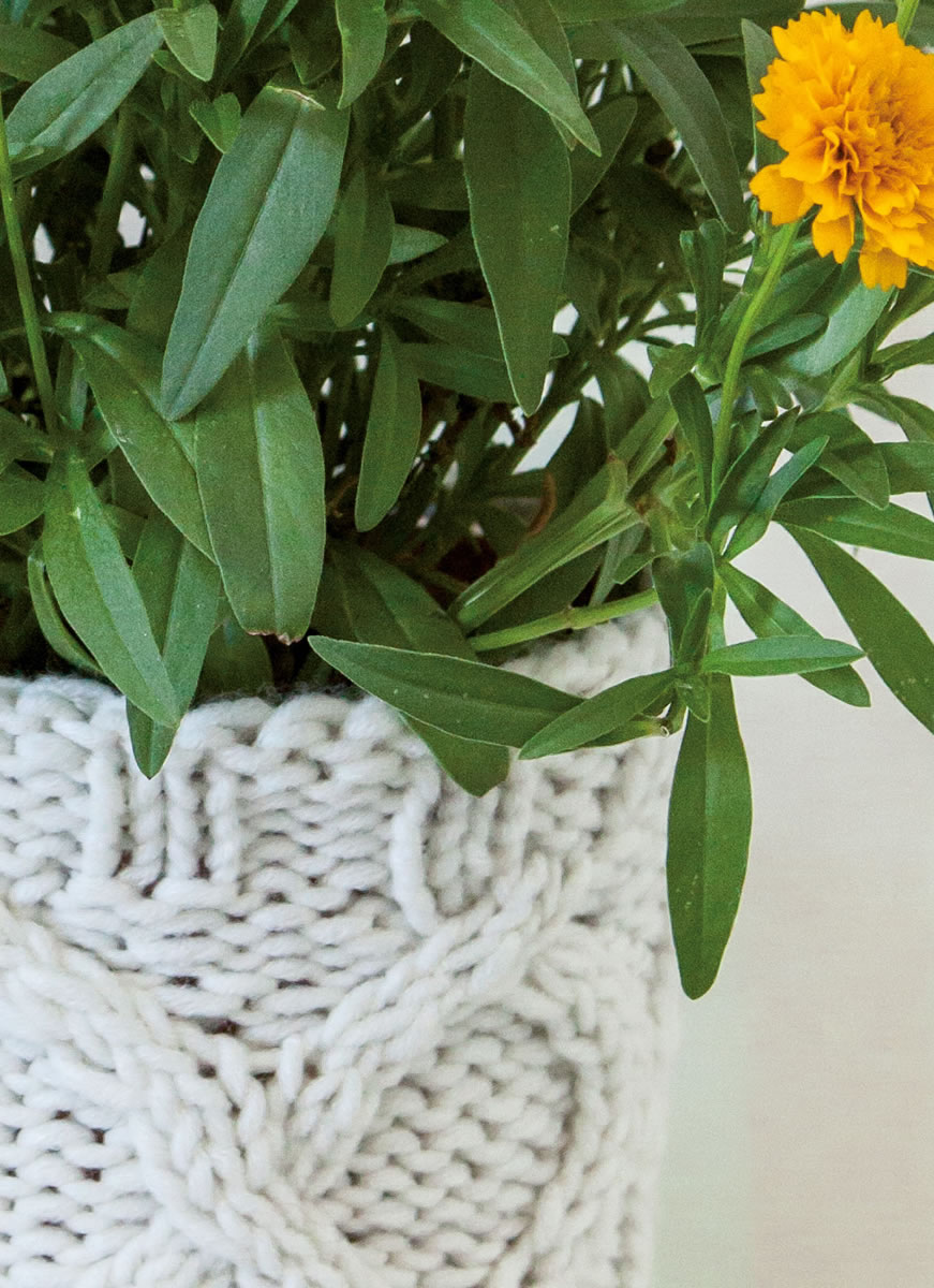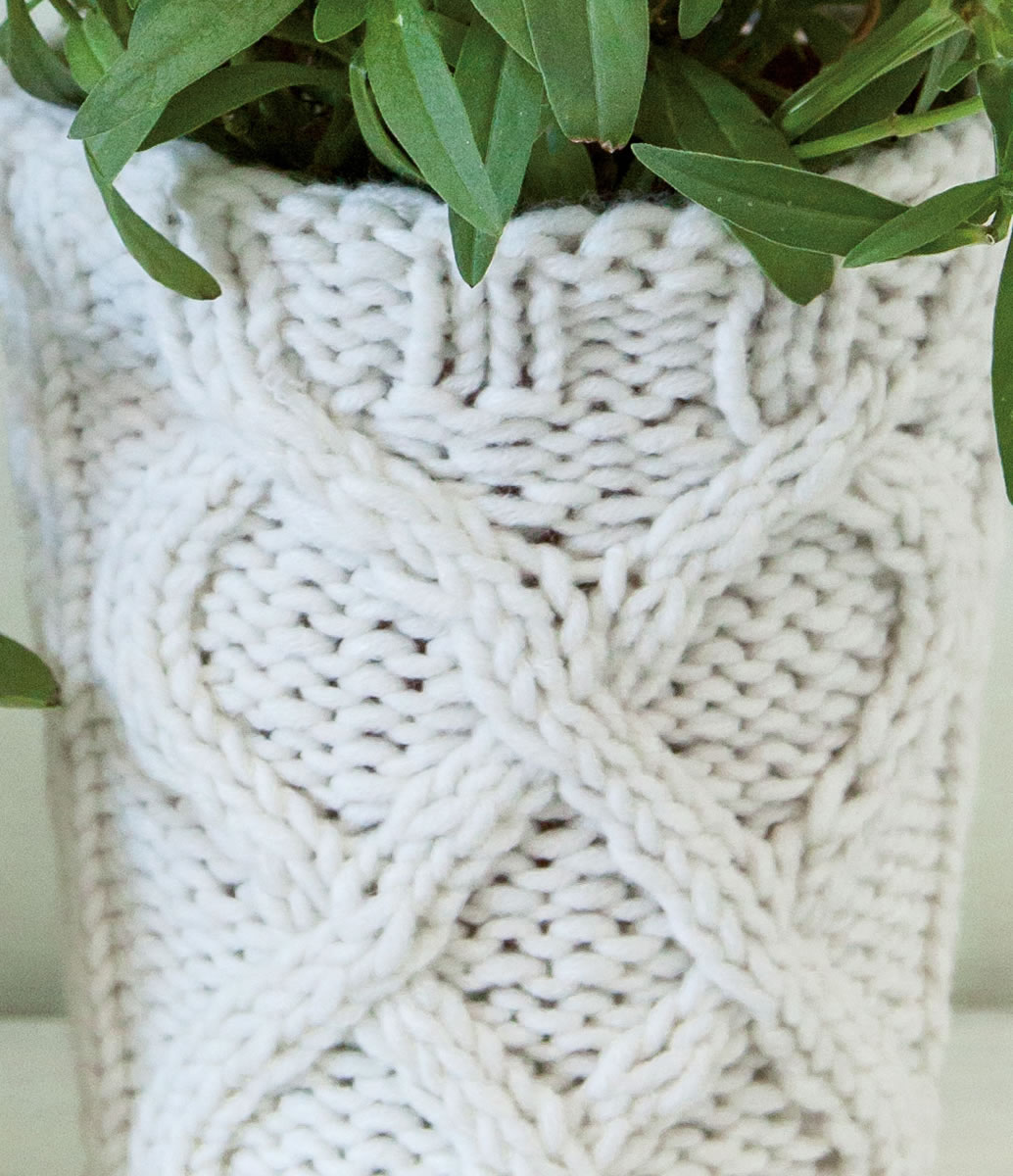 Kabel-boordpatroon of kabel-ruitpatroon? Eén ding is zeker: zo‘n oude bloemenvaas hoeft niet saai te zijn, het is maar wat je ervan maakt! (Omvang ca. 36 cm, passend voor een vaas van 24 cm)