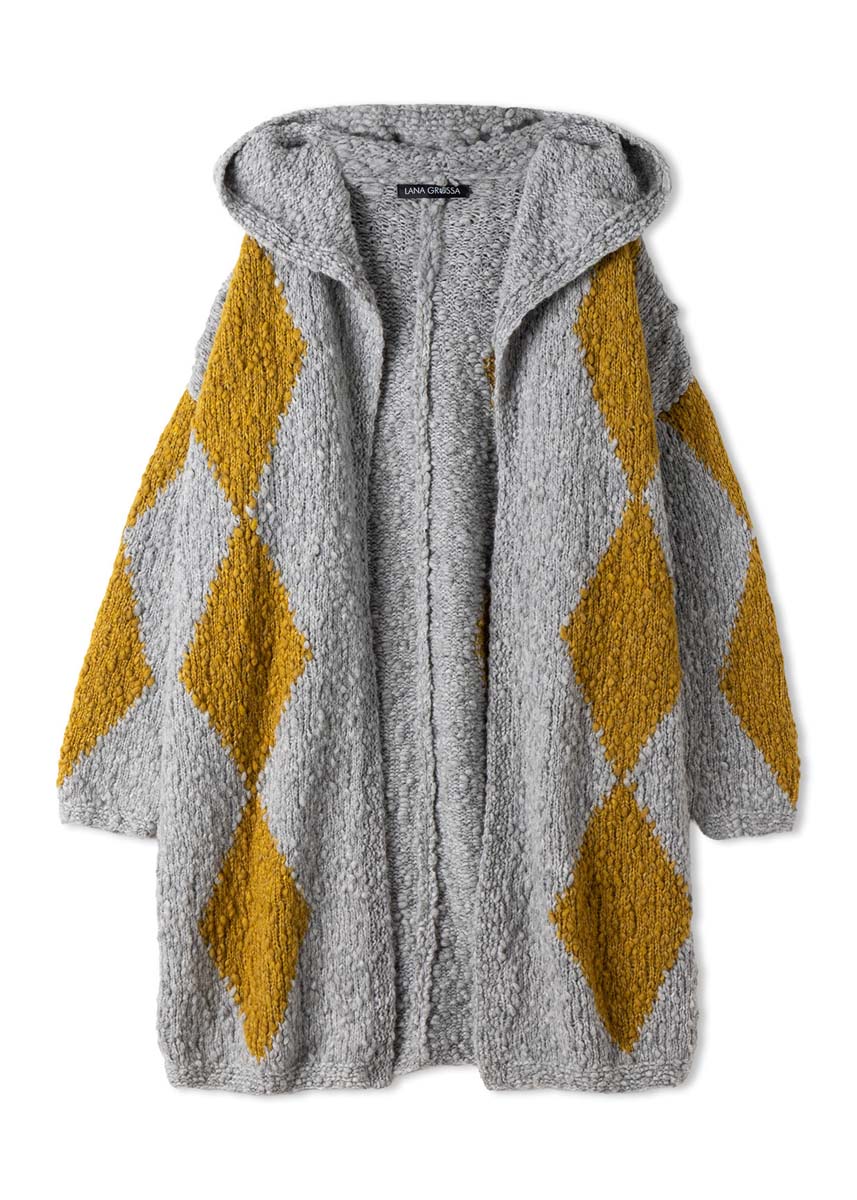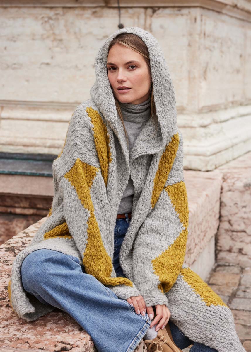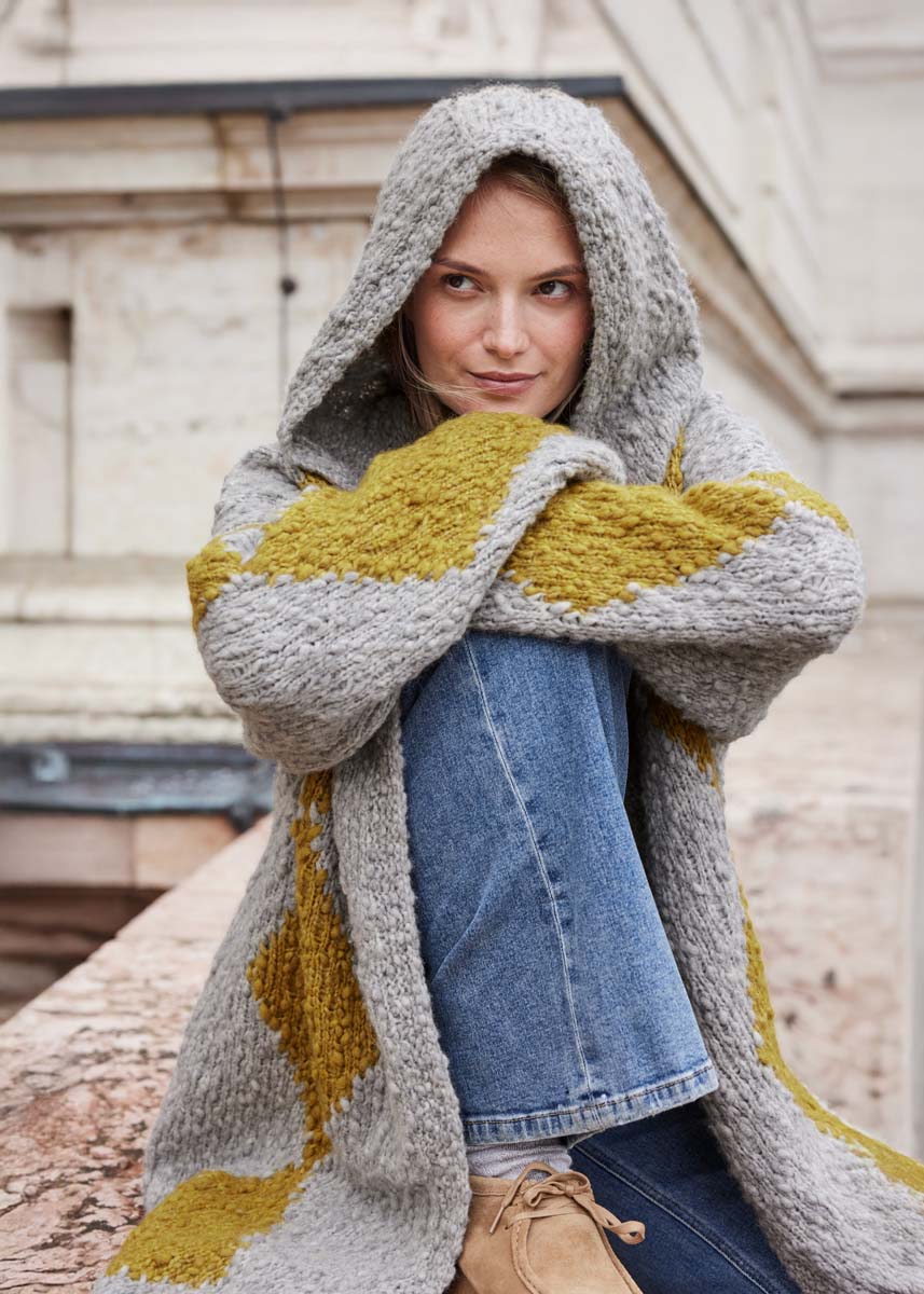 Lana Grossa Caramella (53% scheerwol (merino), 25% (baby) alpaca, 22% polyamide, ca. 110 m/50 g), 600 (650) g lichtgrijs (kl 12) en 200 g mosterdgeel (kl 6); breinld 4,5 mm en 5 mm; 1 rondbreinld 5 mm, 60 cm lang; 1 rondbreinld 4,5 mm, 150 cm lang.