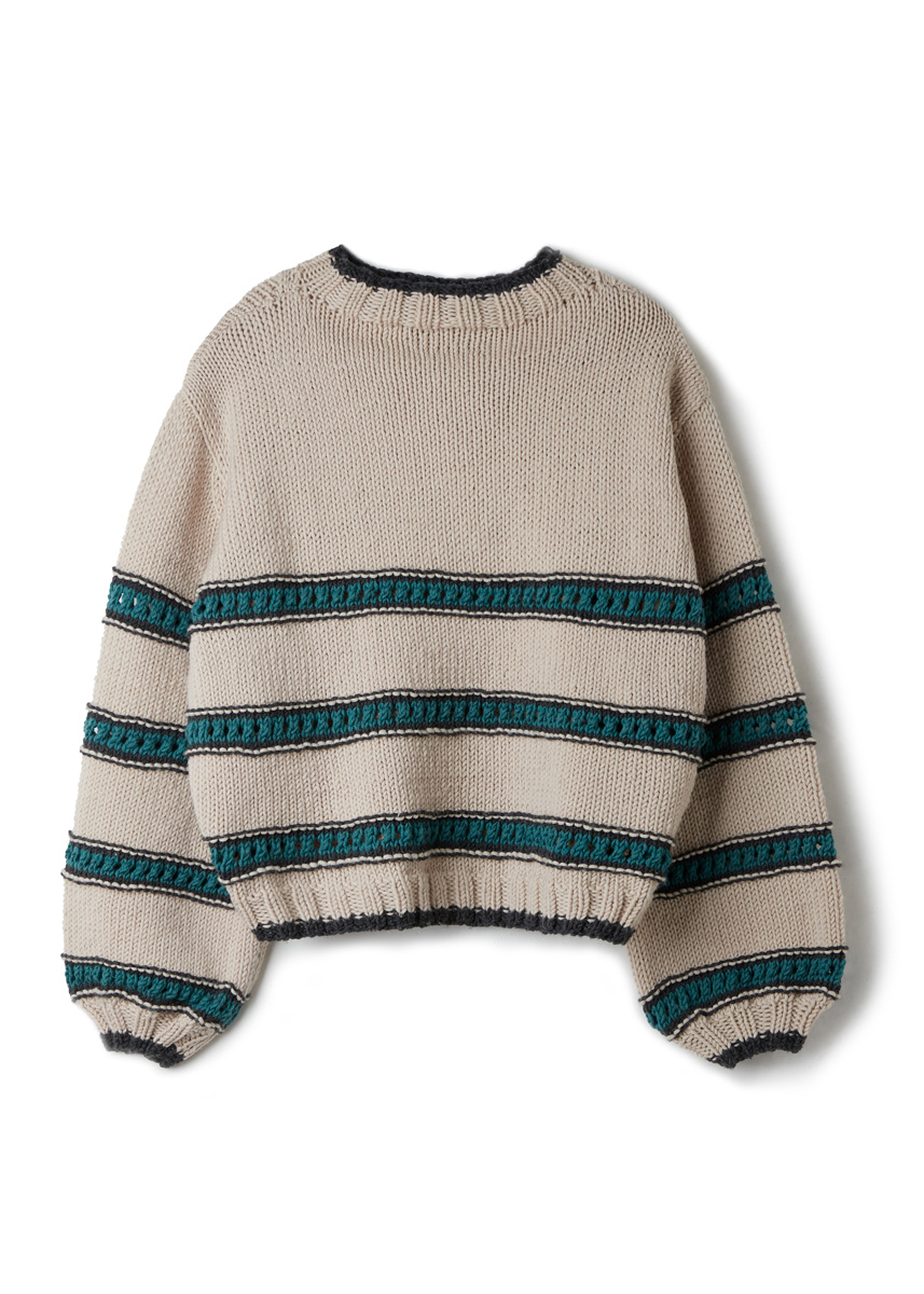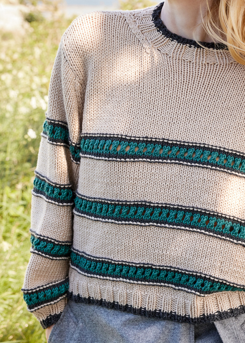 Lana Grossa Cool Wool Superbig Mèlange (100% scheerwol (merino), ca. 80 m/50 g), 400 (450 - 450 - 500 - 550) g beige gemêleerd (kl 214), 100 (150 - 150 - 200 - 200) g donkergrijs gemêleerd (kl 218) en 100 (100 - 100 - 150 - 150) g donkergroen gemêleerd (kl 210), breinld 5,5 mm en 6 mm, 5 breinld zonder knop 5,5 mm.