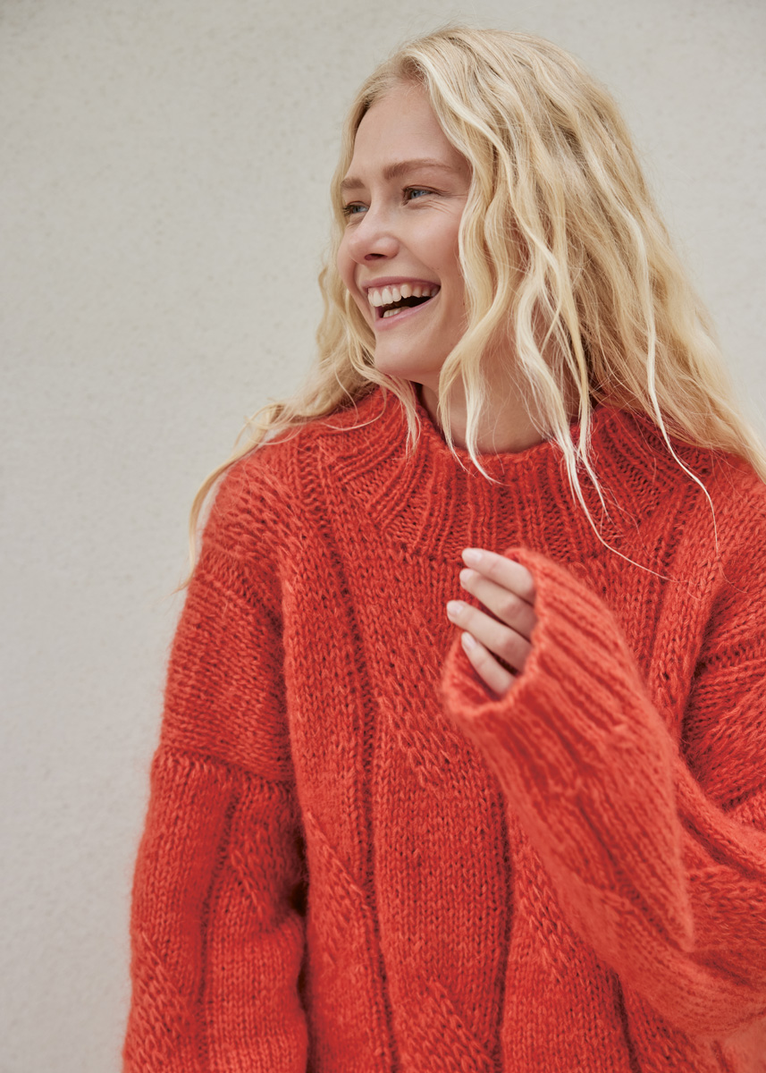 Lana Grossa Mohair di Gio (55% mohair (superkid), 45% scheerwol (merino superfijn), ca. 85 m /50 g): 550 (600 / 650 / 700) g oranjerood (kl 6); 1 rondbreinld 5 mm en 7 mm, 80 – 100 cm lang; kabelnaald.
