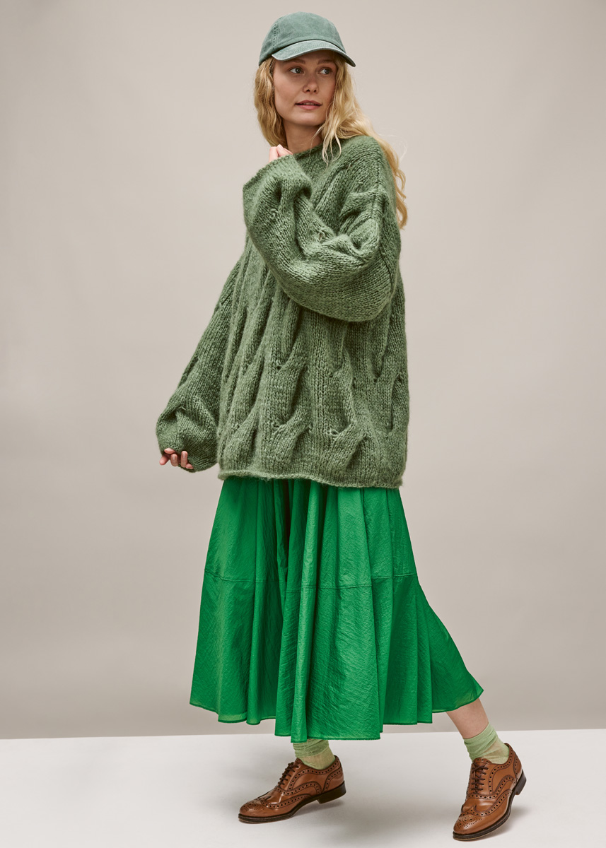 Lana Grossa Mohair di Gio (55% mohair (superkid), 45% scheerwol (merino superfijn), ca. 85 m/50 g): 600 (650 / 700 / 750) g resedagroen (kl 13); 1 rondbreinld 6 mm en 7 mm, 80 – 100 cm lang, 1 rondbreinld 6 mm, 40 cm lang (of volgens de magic-loop-methode breien), 1 kabelnaald.