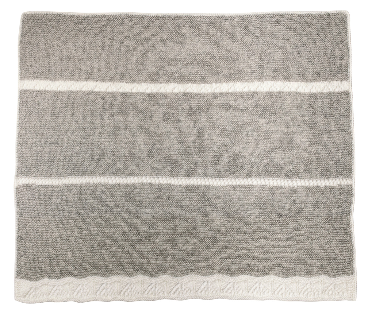 Lana Grossa Ecopuno (72 % katoen, 17 % scheerwol, 11 % alpaca, looplengte 215 m/50 g) 200 g lichtgrijs (kl. 14) en 50 g wit (kl. 26); breinaalden nr. 4,5, haaknaald nr. 4