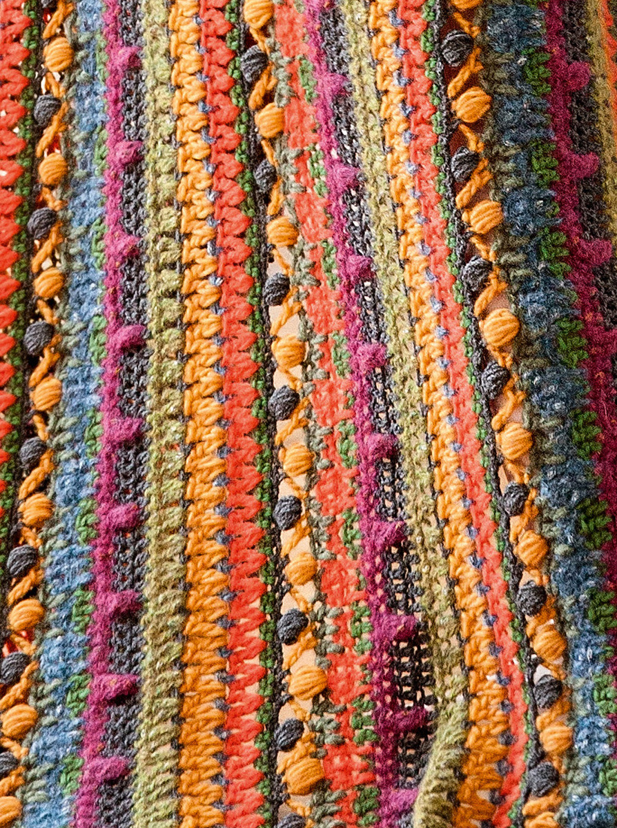 Lana Grossa-garen „Cool Air” (55 % scheerwol (merinoswol), 33 % (baby) alpaca, 12 % polyamide, ll. = ca. 125 m/50 g): ca. 250 g geeloranje (kl. 19) en ca. 100 g grijsgroen (kl. 22), Lana Grossa-garen „Lala Berlin Fluffy” (42 % scheerwol (merinoswol superfijn), 21 % polyamide, 19 % (baby) alpaca, 18 % mohair (superkid), ll. = ca. 130 m/50 g): ca. 200 g mosterd gemêleerd (kl. 123) en telk. ca. 150 g purperrood gemêleerd (kl. 116) en petrol gemêleerd (kl. 117), Lana Grossa-garen „Brigitte No. 2” (47 % (baby) alpaca, 45 % katoen, 8 % scheerwol (merinoswol), ll. = ca. 140 m/50 g): telk. ca. 200 g koraal (kl. 25) en groen (kl. 1) en Lana Grossa-garen „Alta Moda Alpaca” (90 % (baby) alpaca, 5 % scheerwol (merinoswol), 5 % polyamide, ll. = ca. 140 m/50 g): ca. 300 g donkergrijs gemêleerd (kl. 22); 1 haaknaald nr. 7