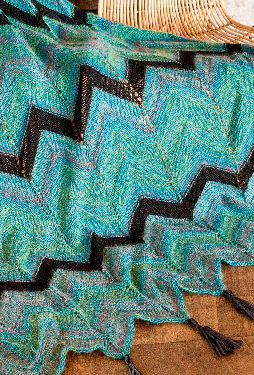 Een fusie, die functioneert: knuffelgarens in zigzagpatroon, franjes met leer-effect en een enorme portie glamour maken van deze plaid een ideale siësta-partner.