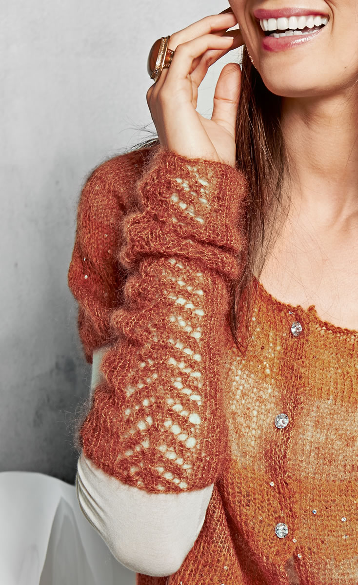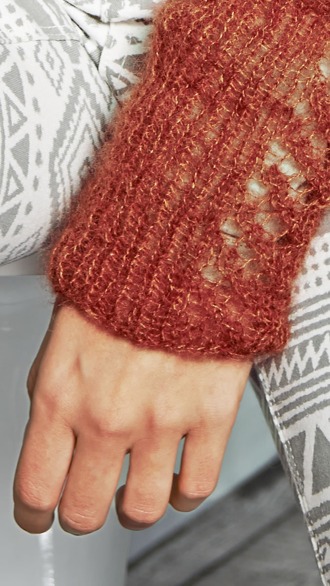 ca. 25 g „Silkhair“ (70% mohair (superkid), 30% zijde, ll. = ca. 210 m/25 g) van Lana Grossa in roodbruin (kl. 49); breinld. zonder knop nr. 4.