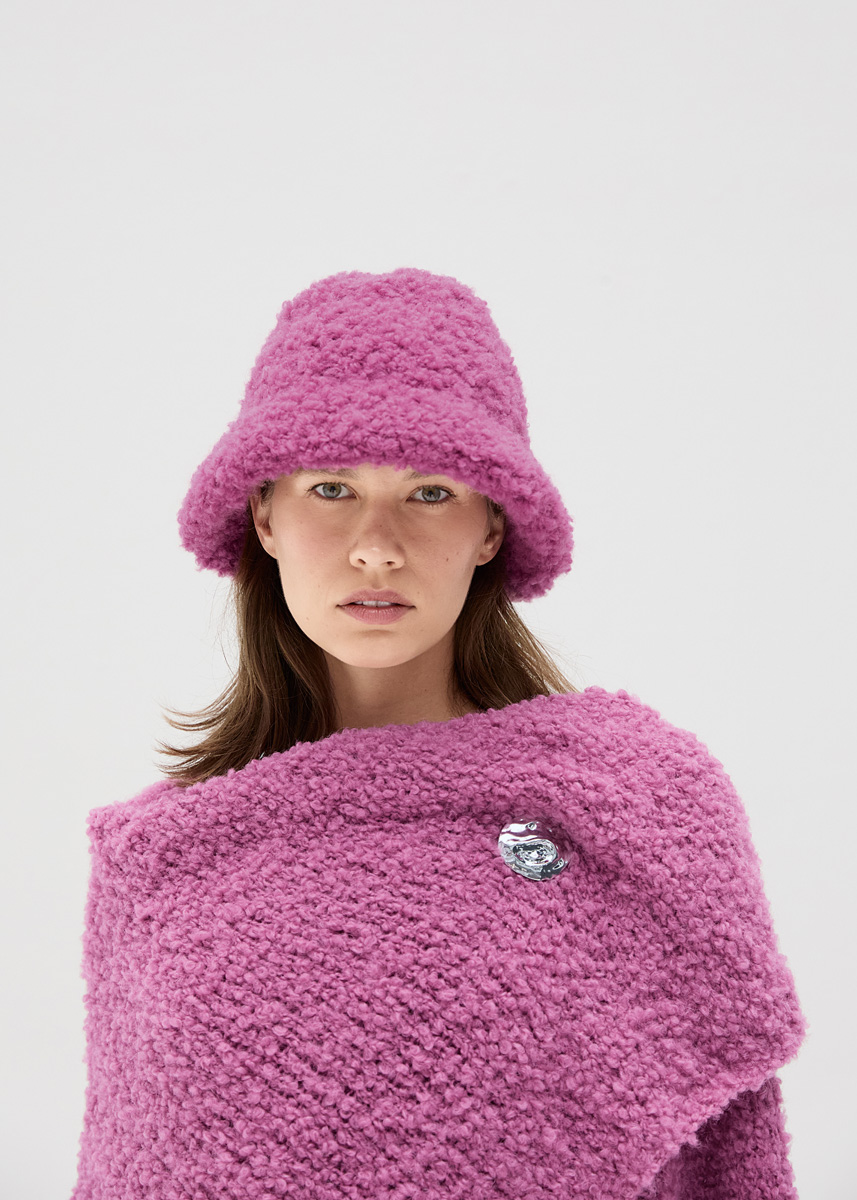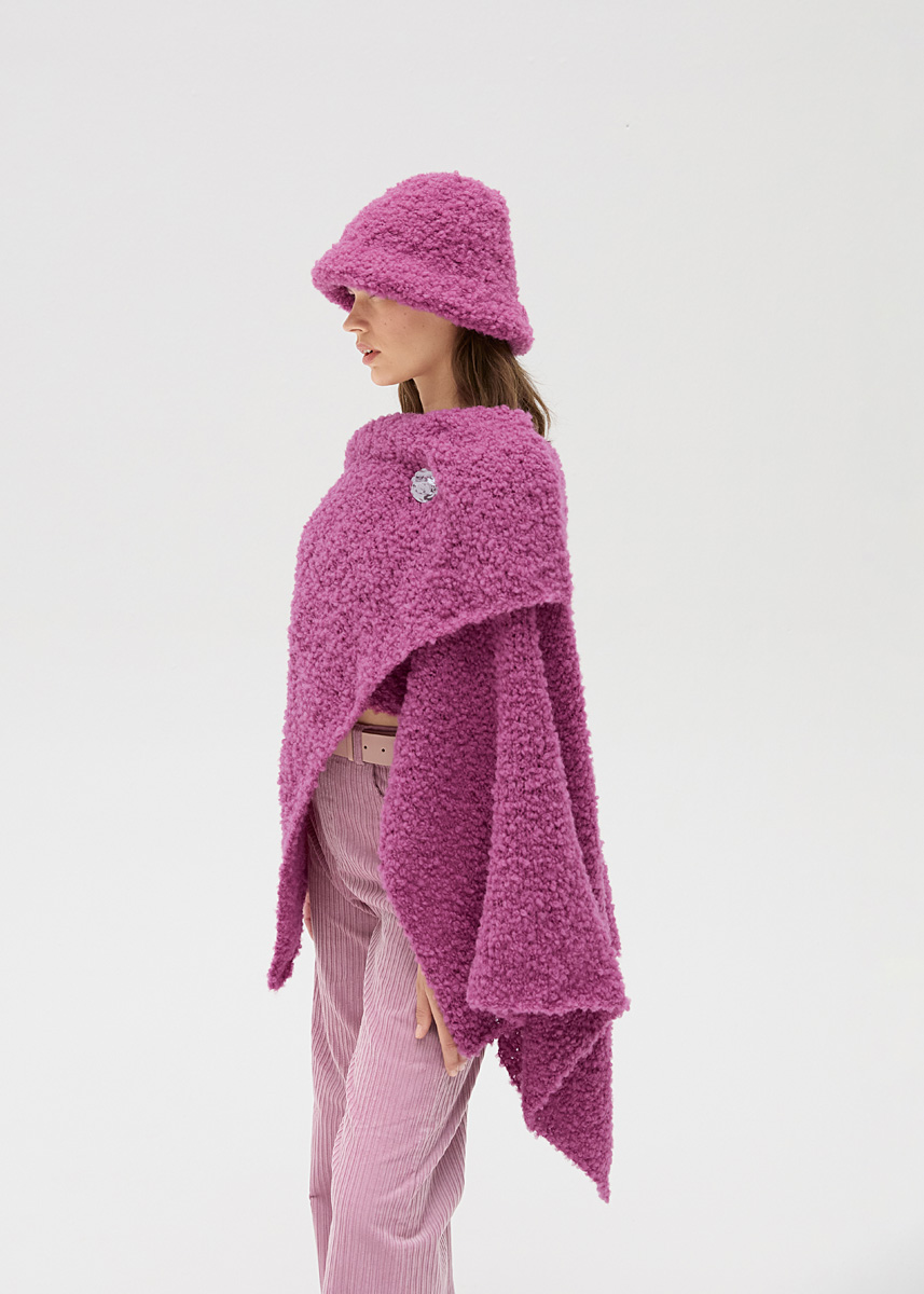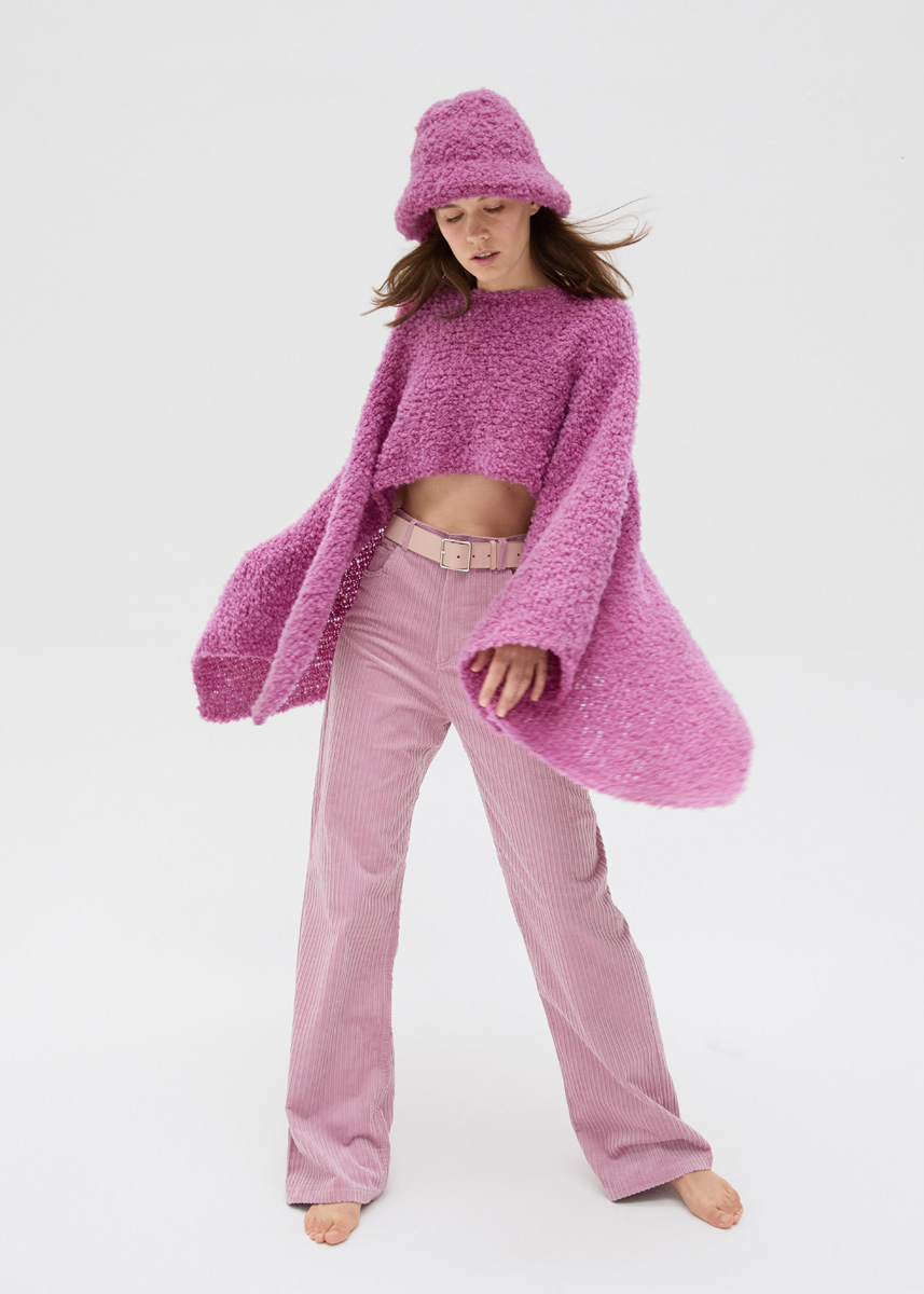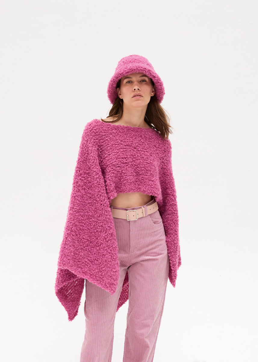 Lana Grossa ‘Orsetto’ (60% scheerwol (merino), 40% alpaca (superfijn), ca. 75 m/50 g): 400 g viooltjesroze (kl 4); breinld 7 mm