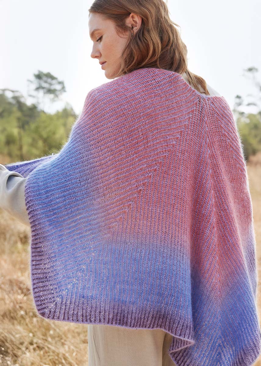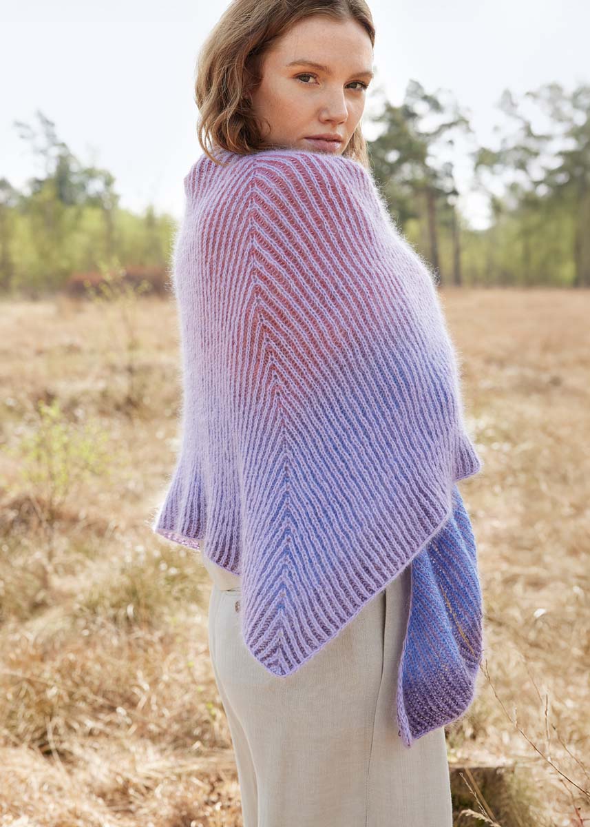 Lana Grossa Merino Lace Aquarell (100% scheerwol (merino), ca. 800 m/100 g), 100 g met donkergrijsviolet/ azuurblauw/zalmrood (kl 17), Lana Grossa Silkhair (70% mohair (superkid), 30% zijde, ca. 210 m/25 g), 100 g met sering (kl 173) en Lana Grossa Cool Wool Lace (100% scheerwol (merino extrafijn), ca. 400 m/50 g), 100 g met paars (kl 47); 1 rondbreinld 4 mm, 120 cm lang, 3 markeerringen