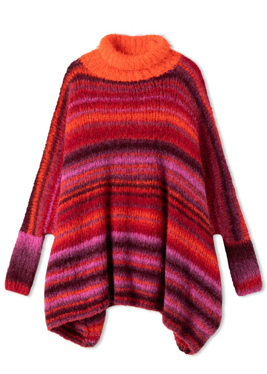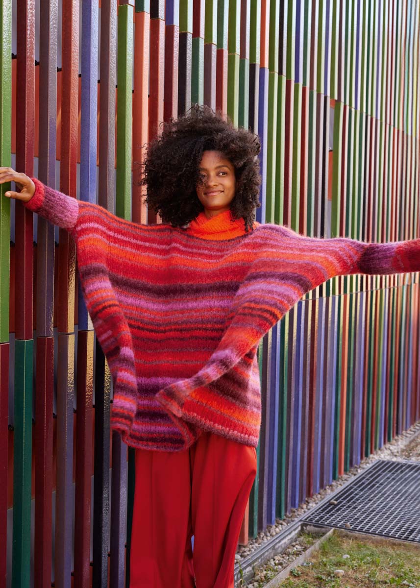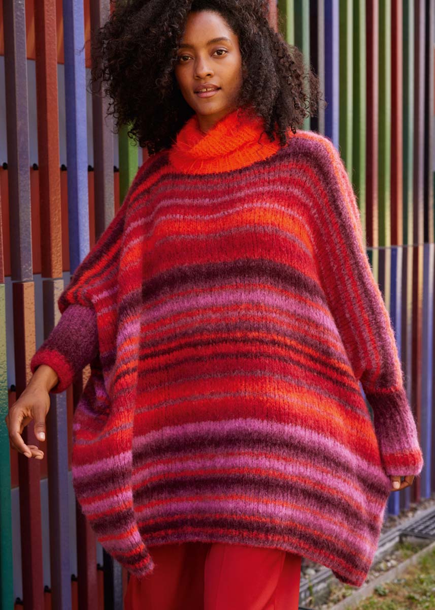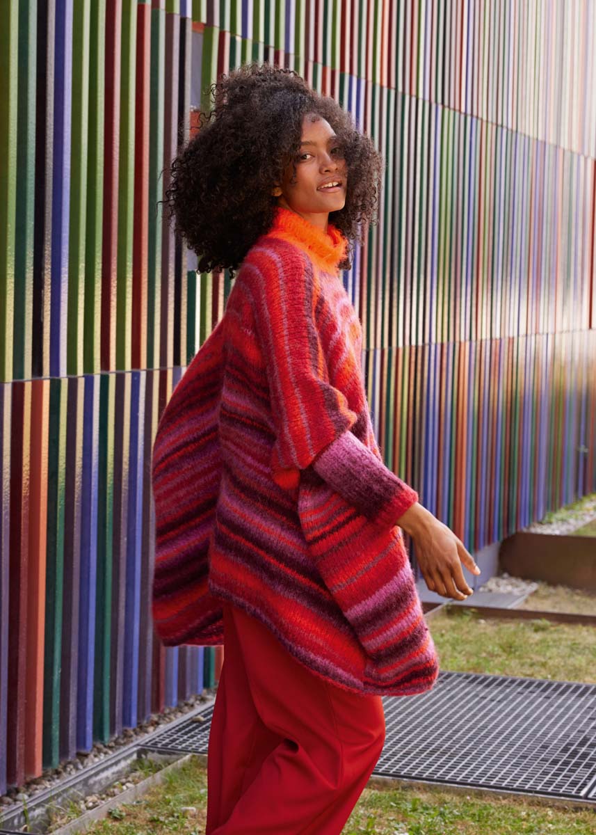 Lana Grossa Gigante (70% alpaca (fijn), 30% polyamide, ca. 300 m/100 g), 400 (500) g Bourgondisch rood/bordeaux/cyclaam/paprikarood/braam (kl 17) en Lana Grossa Basta (50% scheerwol (merino), 50% polyamide, ca. 100 m/50 g), 50 g oranje (kl 11); breinld 7 mm en 8 mm; een 50 cm lange rondbreinld 7 mm