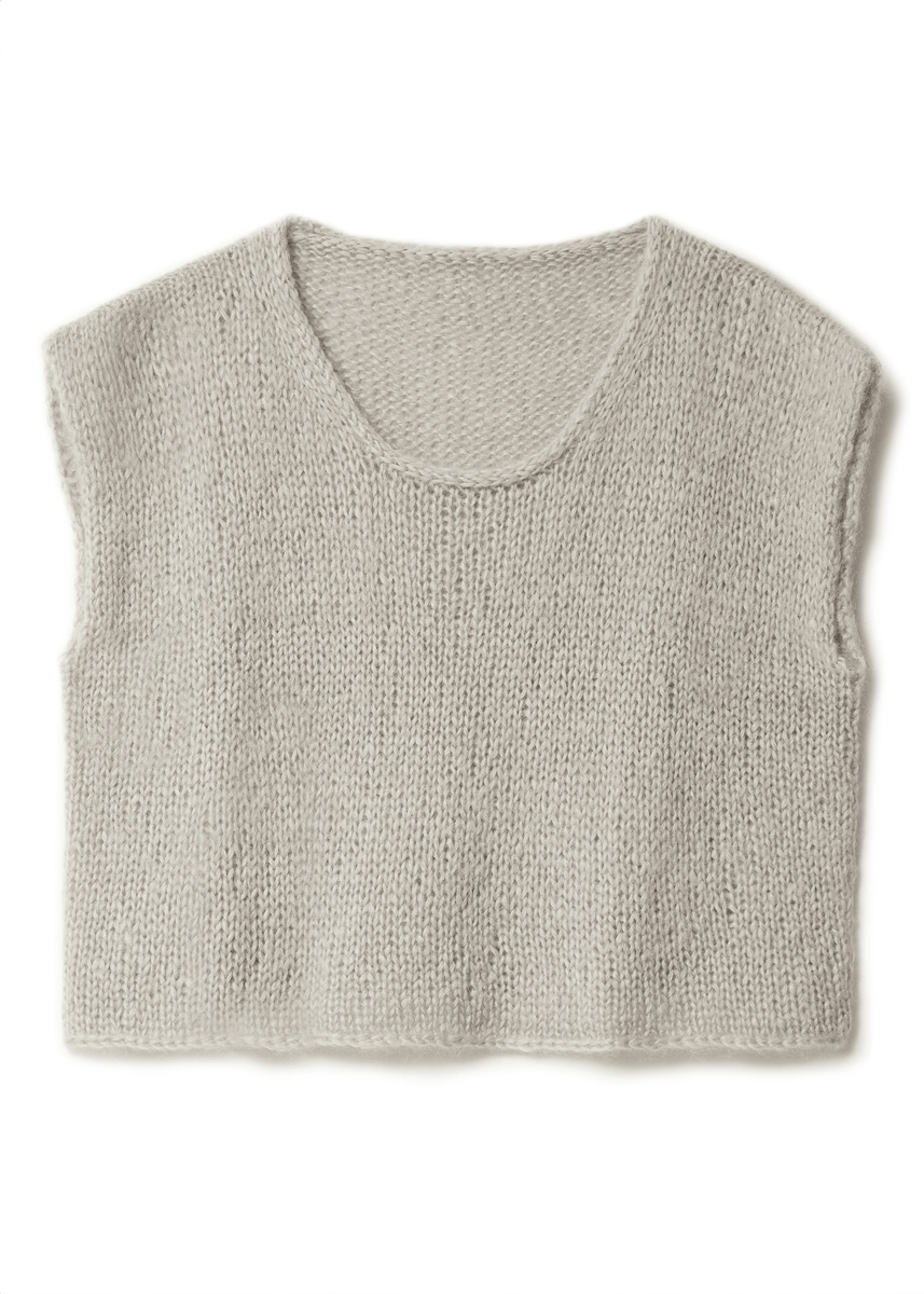 Lana Grossa Superkid Seta 65% mohair (superkid), 35% zide, ca. 100/25 g: 150 (150) 150 (200) 200 (250) 300 (300) g grijsbeige (kl 18) Rondbreinaald 8 mm,80- 100 cm lang 2 breinld zonder knop 8 mm (heb je niet nodig als de rand met I-cord met de rondbreinld gebreid wordt markeerring 2 verwijderbare markeerring (alternatief 2 velligheidsspelden)