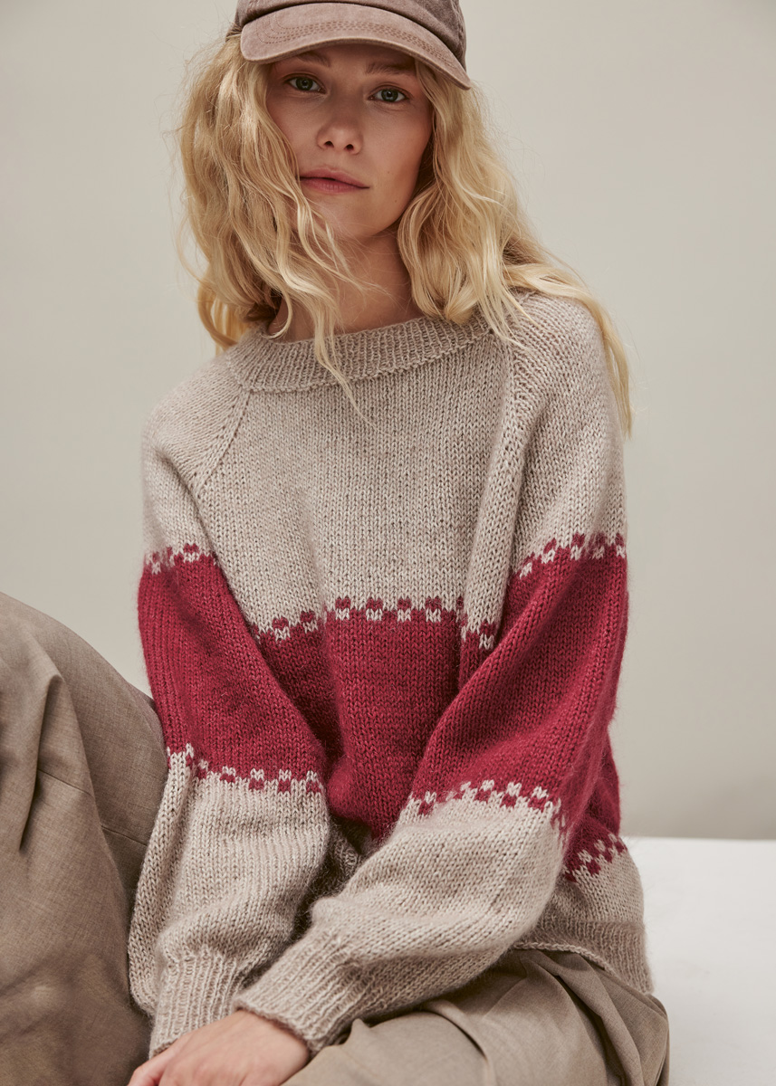 Lana Grossa Natural Lama Fine (100% lama (baby), ca. 150 m/50 g): 200 (250 / 250 / 300) g grijsbeige (kl 112) en 150 (150 / 200 / 200) g wijnrood (kl 117) en Lana Grossa Silkhair (70% mohair (superkid), 30% zijde, ca. 210 m/25 g): 50 (75 / 75 / 75) g bordeaux (kl 113) en 75 (75 / 100 / 100) g parelbeige (kl 123); 1 rondbreinld 4 mm en 5 mm, 80 – 100 cm lang (als de omvang vrij klein is volgens de magic-loop-methode br of met breinld zonder knop 4 mm en 5 mm br); 5 markeerringen, daarbij 1 in een andere kleur of met een andere vorm = het begin bij de toer (TIP: eventueel markeerringen met nr. 0 t/m 4 nemen. Alternatief: een klein etiket met nummer eraan vastzetten)