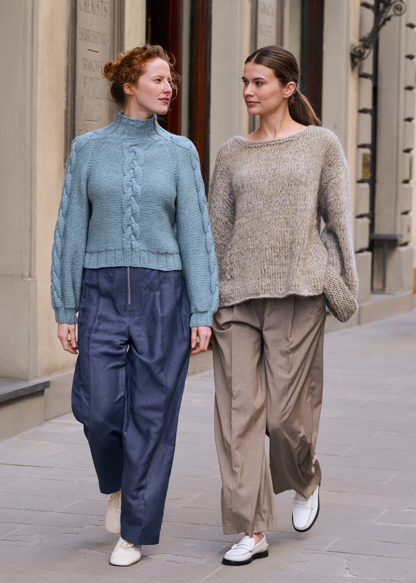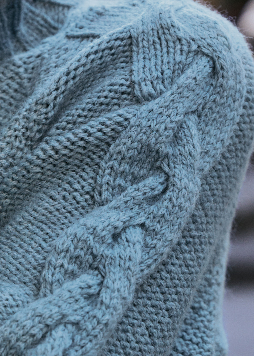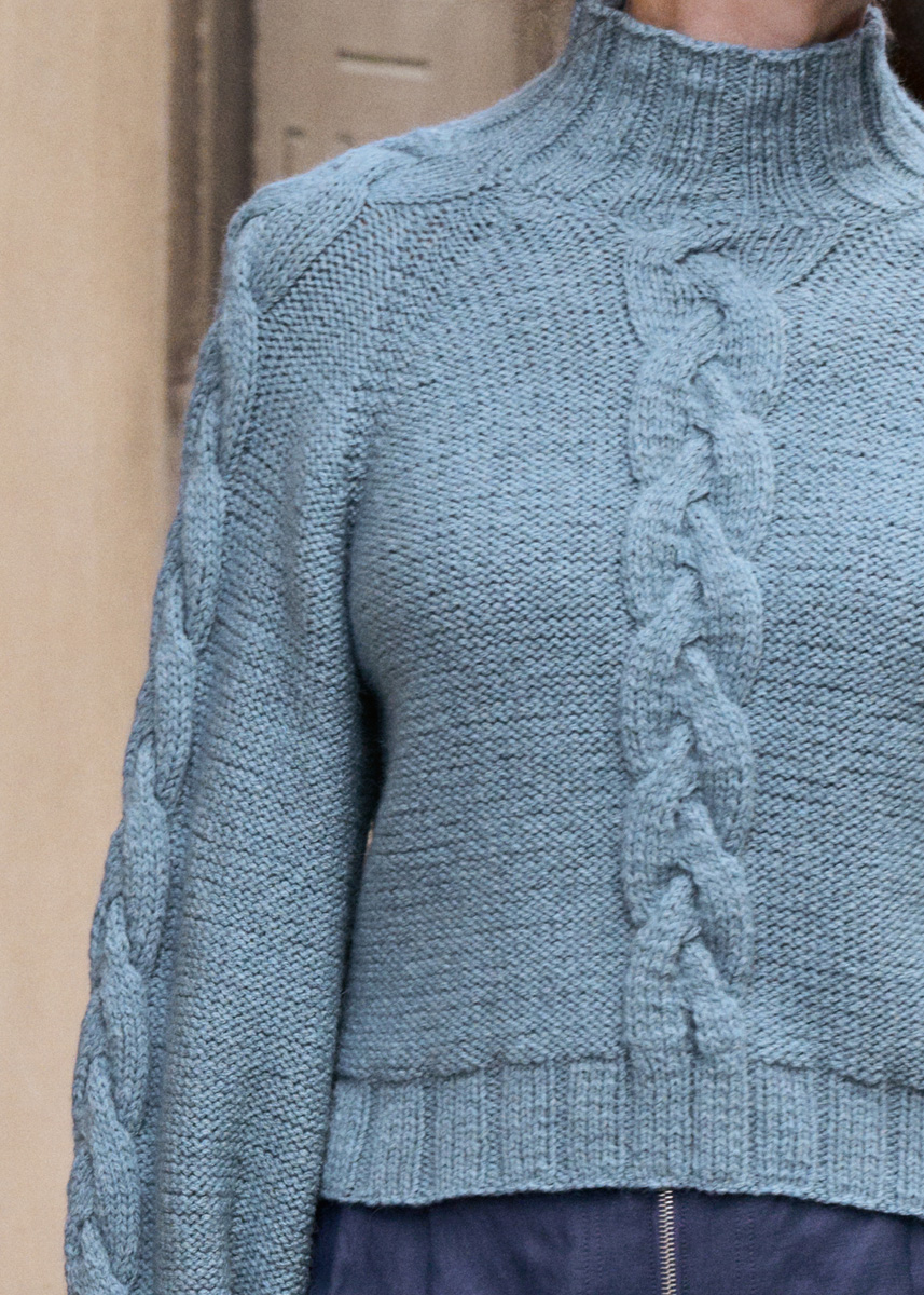 Lana Grossa-garen ‘Alta Moda Alpaca’ (90% alpaca (baby), 5% scheerwol (merino), 5% polyamide, ca. 140 m/50 g): ca. 450 (500 - 550 - 600) g licht jeansblauw (kl 81); breinld 5 mm en 6 mm; 1 korte rondbreinld 5 mm; 1 kabelnaald.