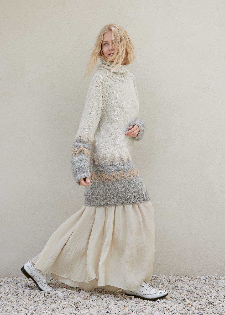 Lana Grossa Natural Alpaca Pelo (63% katoen, 31% alpaca (baby), 6% scheerwol (merino), ca. 125 m/50 g): 300 (350 / 350 / 400) g gebroken wit/lichtgrijs (kl 2) en 150 (200 / 200 / 250) g lichtgrijs gemêleerd (kl 3) en Lana Grossa Orsetto (60% scheerwol (merino), 40% alpaca (superfijn), ca. 75 m/50 g: 100 (100 / 100 / 150) g lichtgrijs (kl 14), 50 (50 / 50 / 100) g beige (kl 6) en 50 (100 / 100 / 100) g greige (kl 7); 1 rondbreinld 6 mm, 80 – 100 cm lang (als de omvang vrij klein is volgens de magic-loop-methode br of met een heel korte rondbreinld 6 mm br).