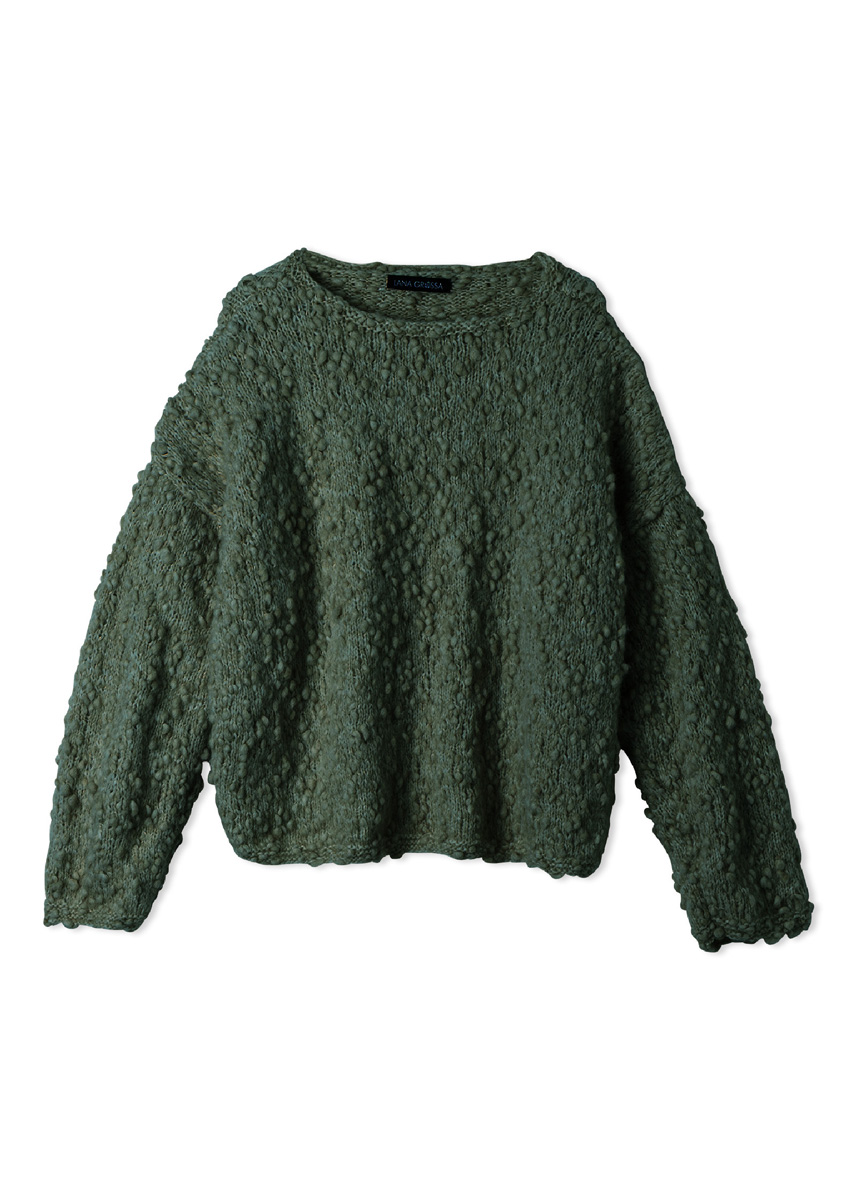 Lana Grossa-garen ‘Caramella’ (53% scheerwol (merino), 25% (baby) alpaca, 22% polyamide, ca. 110 m/50 g): ca. 450 (500) g donkergroen (kl 7); breinld 4,5 mm en 5,5 mm, 1 rondbreinld 4,5 mm, 50 cm lang.