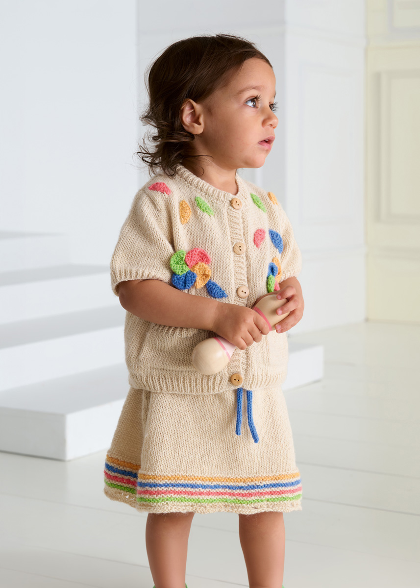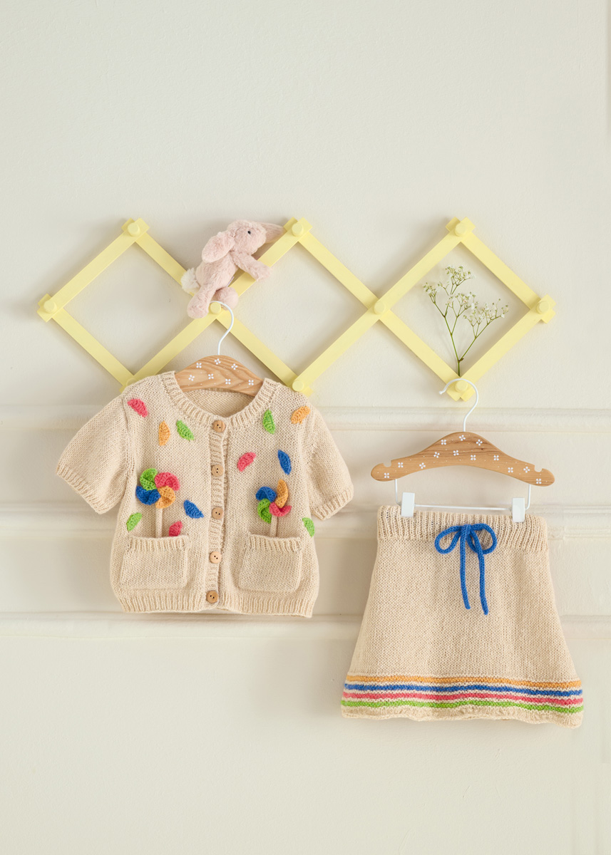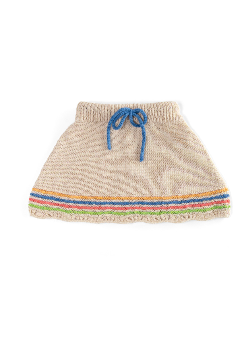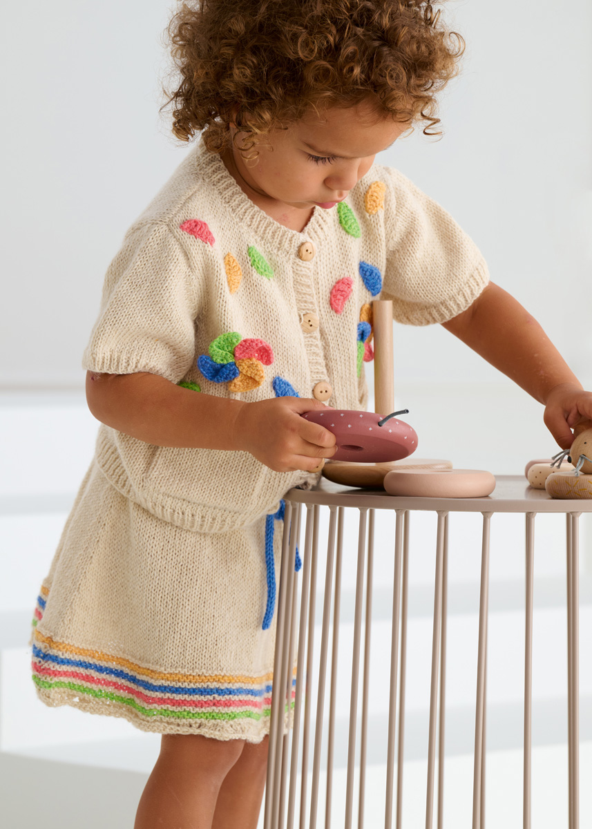 Lana Grossa Ecopuno (72% katoen, 17% scheerwol (merino), 11% alpaca (baby); ca. 215 m/50 g): 100 (100/100/150) g parelbeige (kl 66) en 50 g lentegroen (kl 215), gentiaanblauw (kl 213), kreeftrood (kl 90) en saffraangeel (kl 216); rondbreinld 3,5 mm en 4 mm; haaknld 3 mm; markeerringen; 42 (46/50/56) cm elastiek, 3 cm breed.