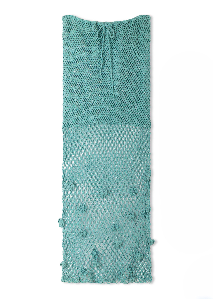 Lana Grossa-garen ‘Filo Paillettes’ (55% polyester, 39% katoen, 6% polyamide, ca. 155 m/50 g): ca. 400 (450) g turquoise (kl 11); 1 haaknld 2 mm en 3,5 mm.