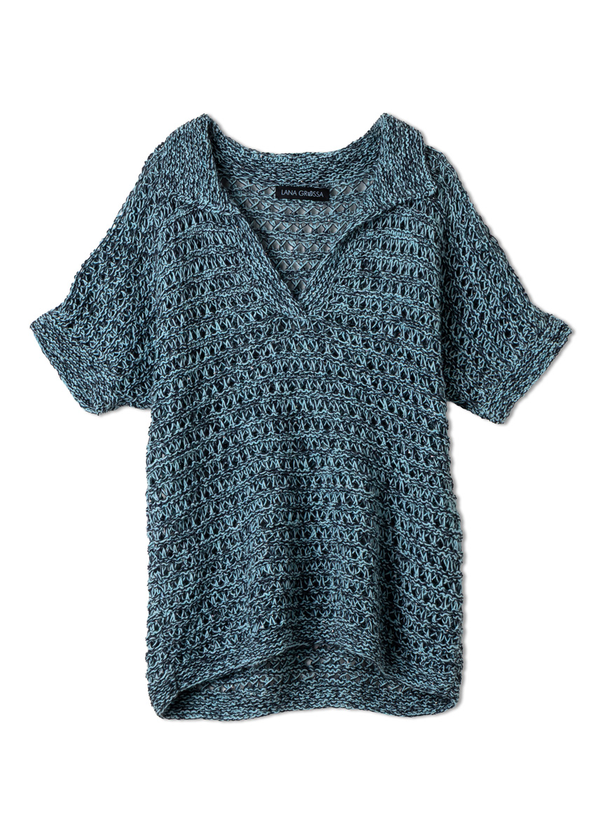 Lana Grossa Ecopuno (72% katoen, 17% scheerwol (merino), 11% alpaca (baby), ca. 215 m/50 g), 200 (200 - 250 - 250) g in lichtturquois (kl 77) en Filo Paillettes (55% katoen, 39% polyester, 6% polyamide, ca. 155 m/50 g), 250 (300 - 350 - 350) g in nachtblauw (kl 15). Breinld 5 mm en 6 mm, 1 rondbreinld 4,5 mm en 5 mm, 40 cm lang.
