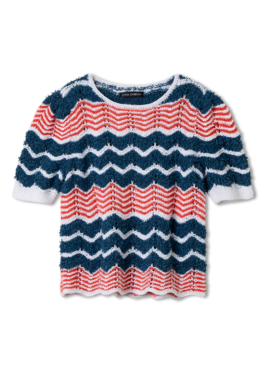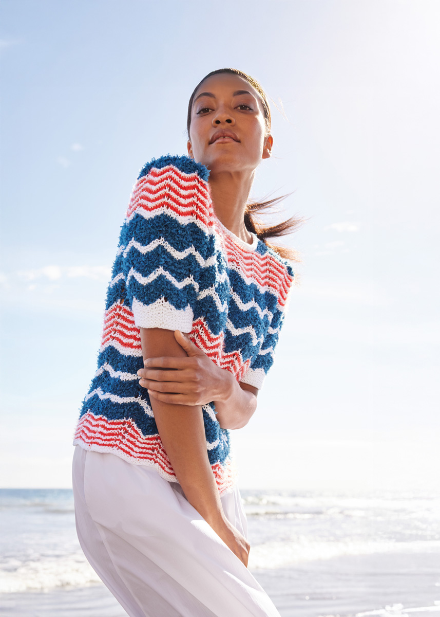 Lana Grossa Landlust Baumwolle (100% katoen (bio), ca. 115 m/50 g), 150 (200 - 200) g in wit (kl 4), Lana Grossa Frizzante (54% katoen, 46 polyamide, ca. 105 m/50 g), 150 (200 - 200) g in petrolblauw (kl 7) en Lana Grossa Per Fortuna (74% katoen (bio), 26% polyamide, ca. 190 m/50 g), 50 (100 - 100) g in felrood (kl 64). Breinld 4 mm, 1 rondbreinld 4 mm, 40 cm lang.